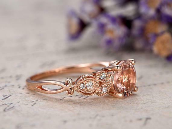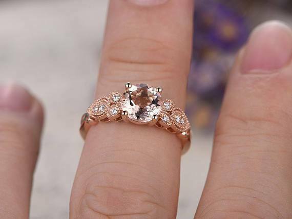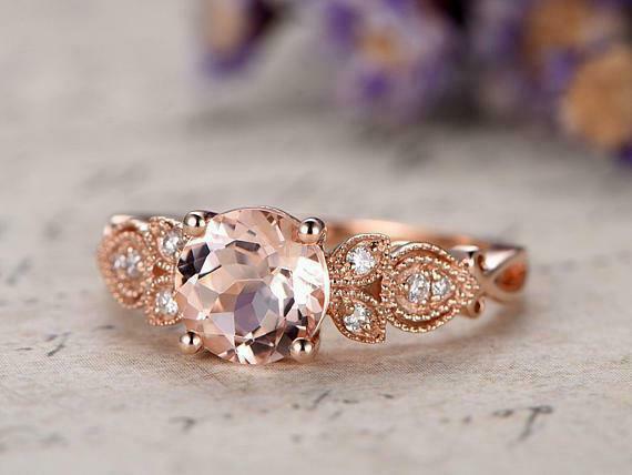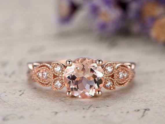 1.2ct Round Peach Morganite Engagement Ring 14k RoseGold Finish Antique Milgrain