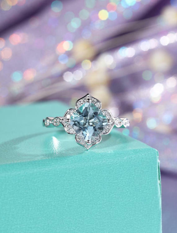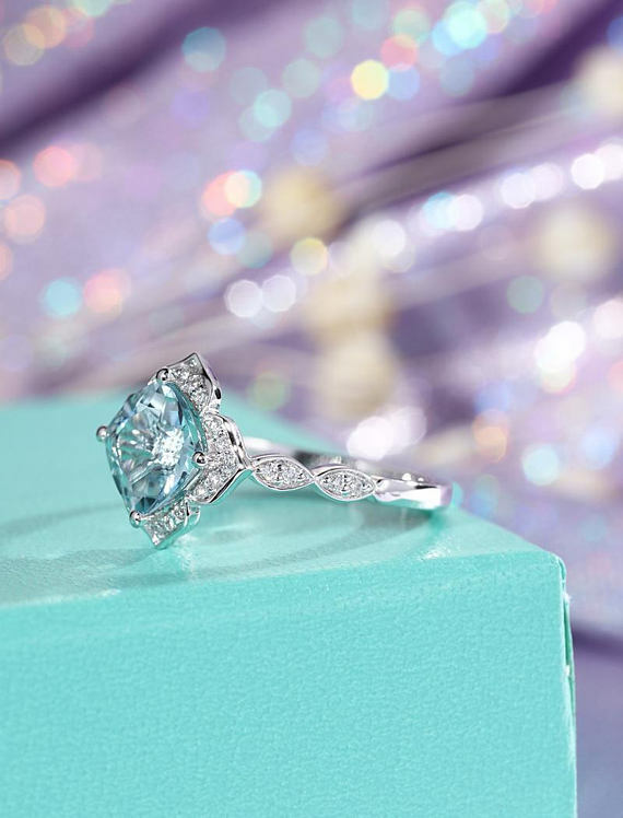1.3ct Cushion Cut Blue Aquamarine Engagement Ring 14k White Gold Finish Art Deco