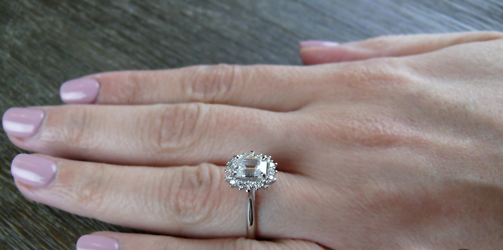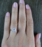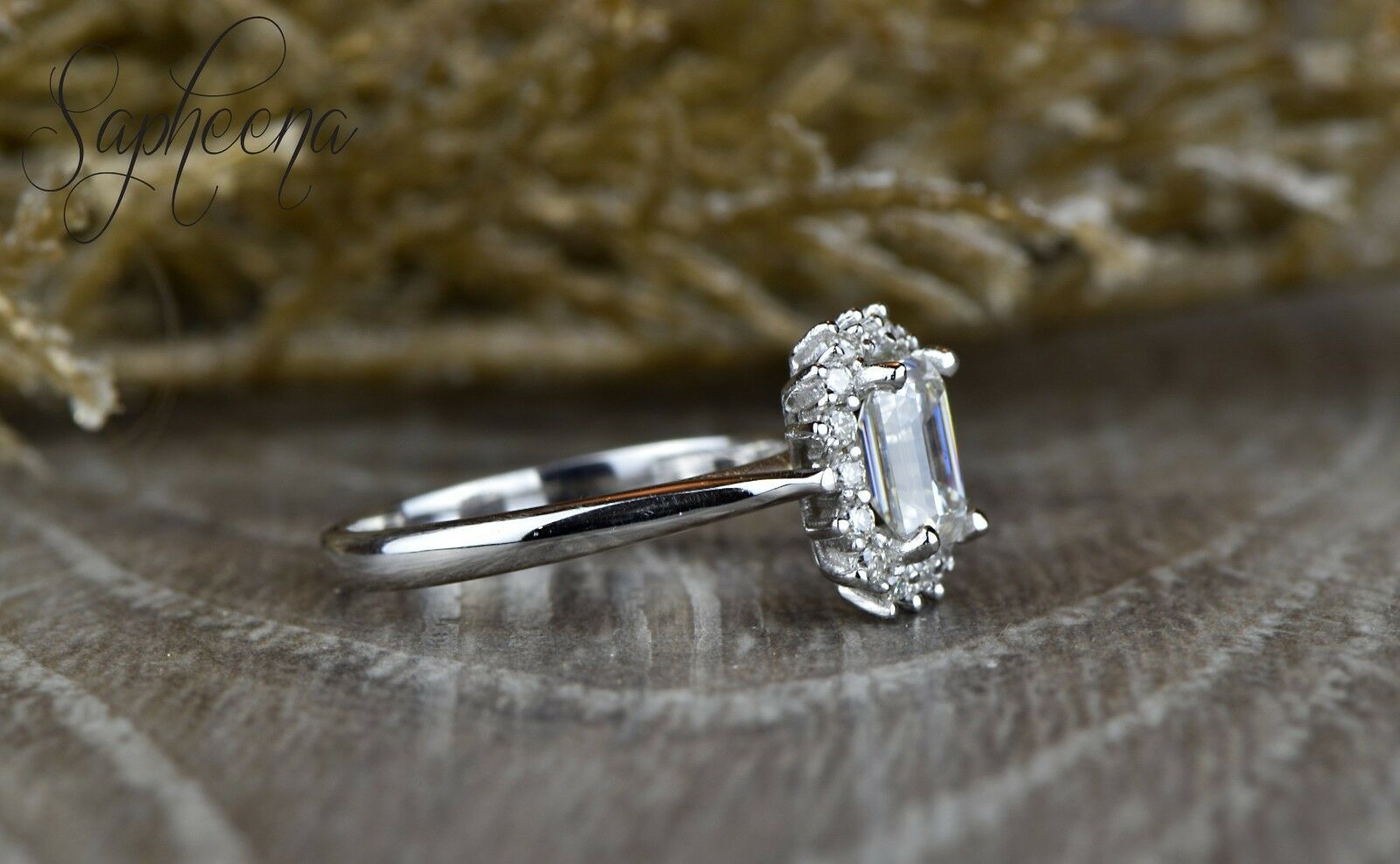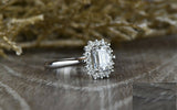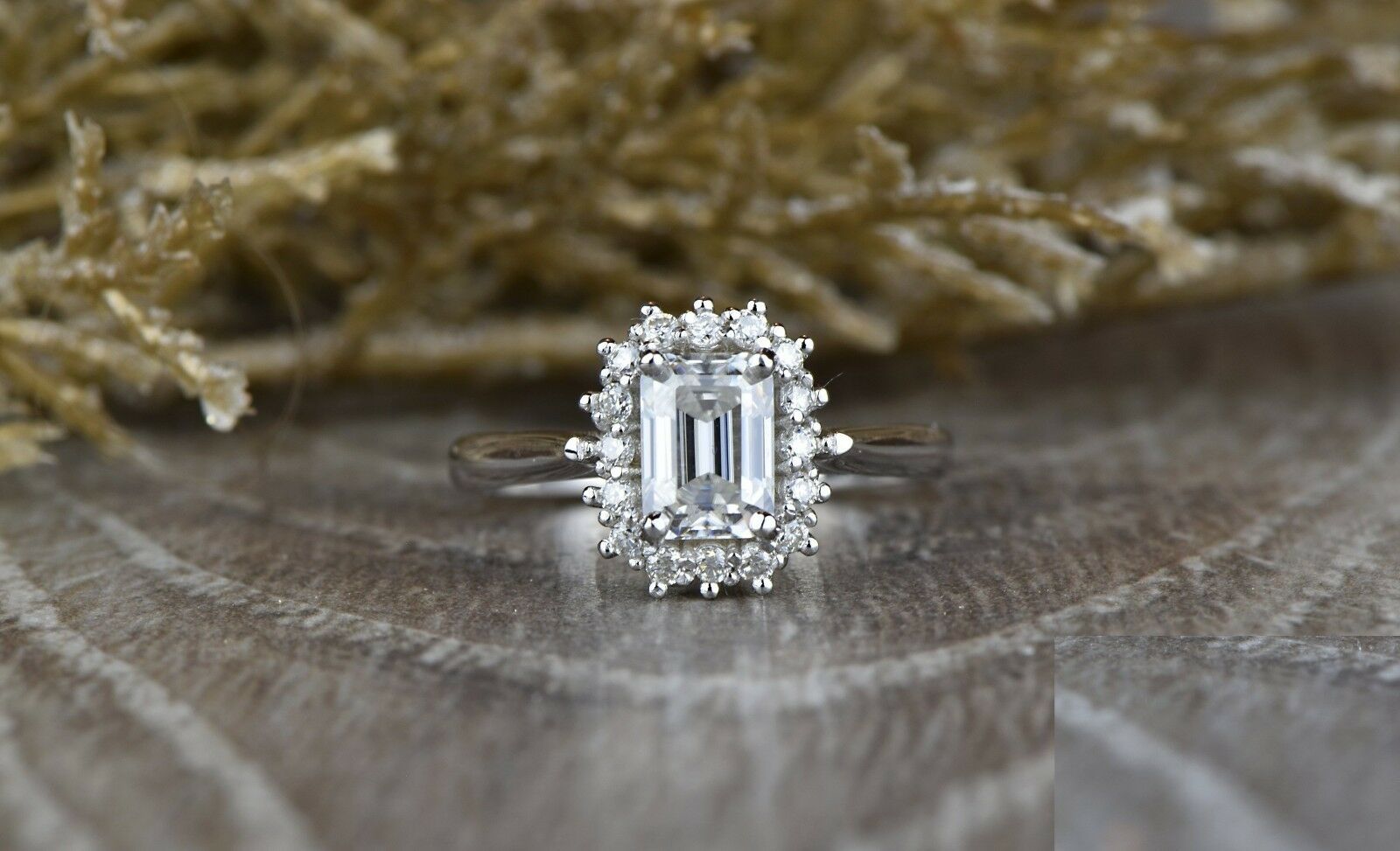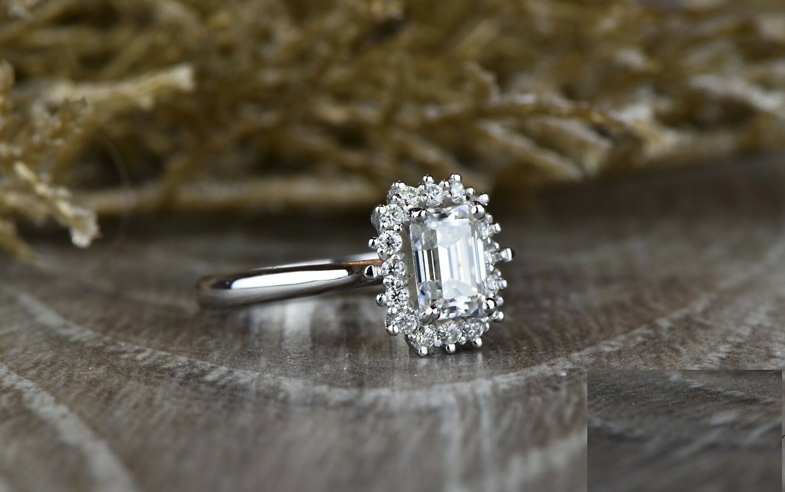1.3ct Emerald Cut Diamond Engagement Ring 14k White Gold Finish Halo Solitaire