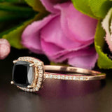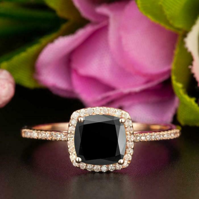 1.5ct Cushion Cut Black Diamond Engagement Ring 14k RoseGold Over Halo Solitaire
