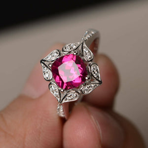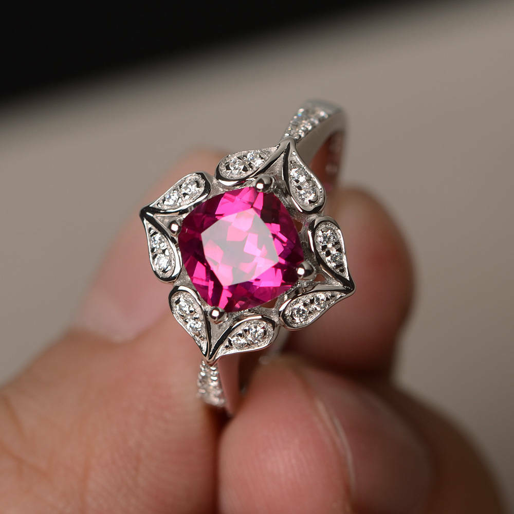 1.5ct Cushion Cut Pink Ruby Engagement Ring 14k White Gold Finish Floral Women