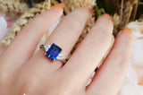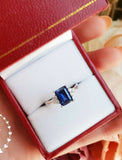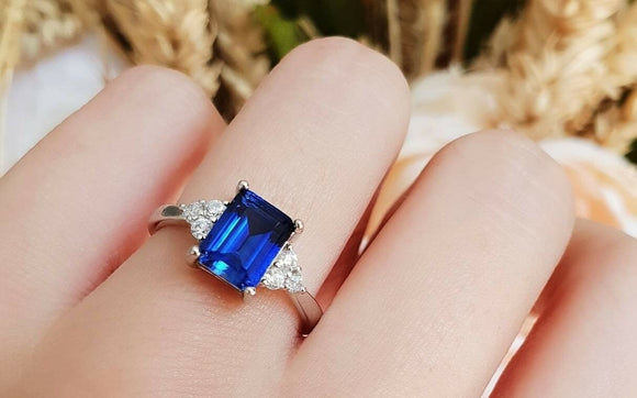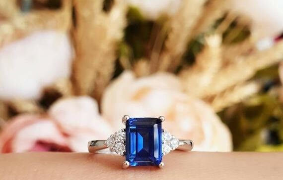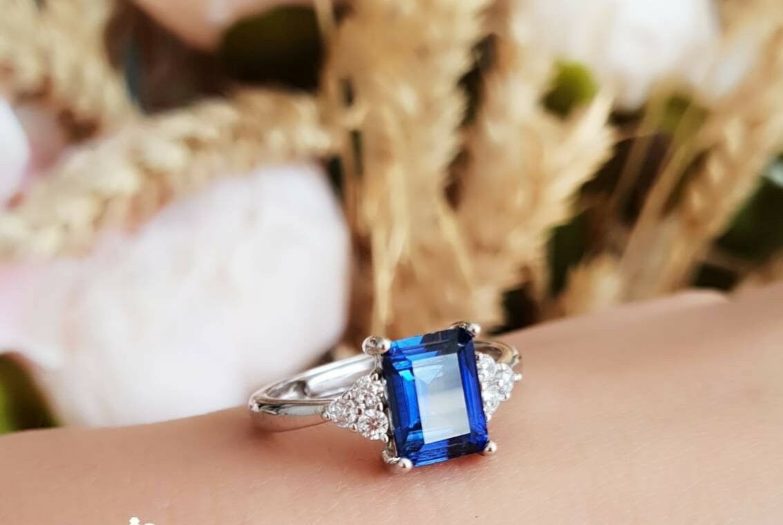 1.5ct Emerald Cut Blue Sapphire Engagement Ring 14k White Gold Finish Trilogy