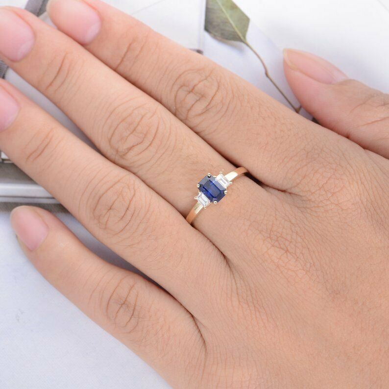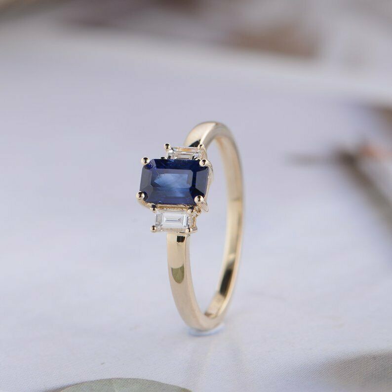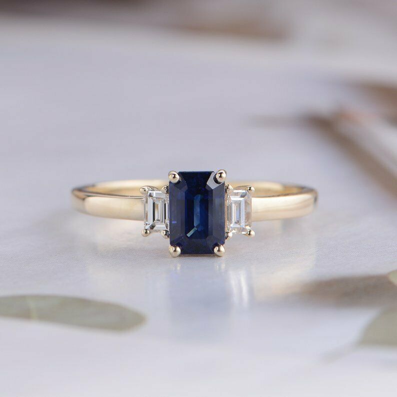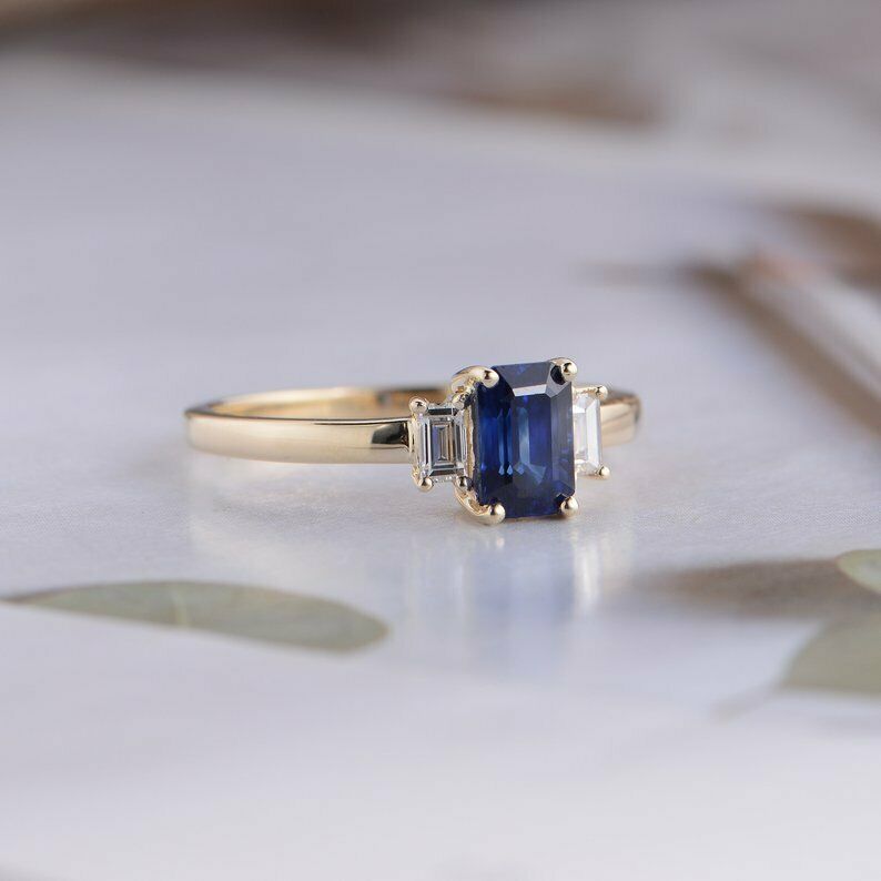1.5ct Emerald Cut Blue Sapphire Engagement Ring Diamond Trilogy 14k Yellow Gold Finish