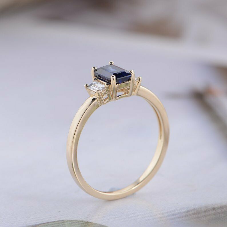1.5ct Emerald Cut Blue Sapphire Engagement Ring Trilogy 14k Yellow Gold Finish