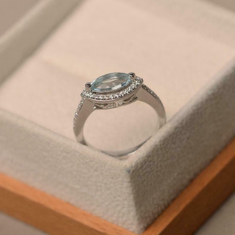 1.5ct Marquise Cut Blue Aquamarine Engagement Ring Diamond Halo 14k White Gold Finish