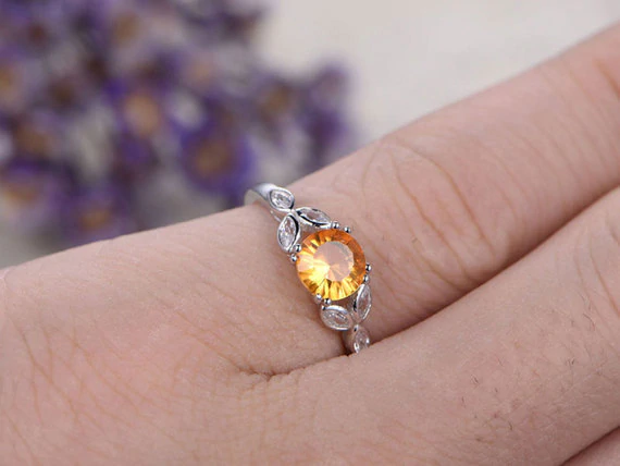 1.5ct Round Cut Yellow Citrine Engagement Ring Floral Leaf 14k White Gold Finish