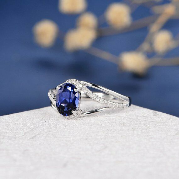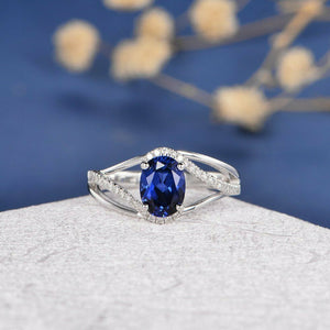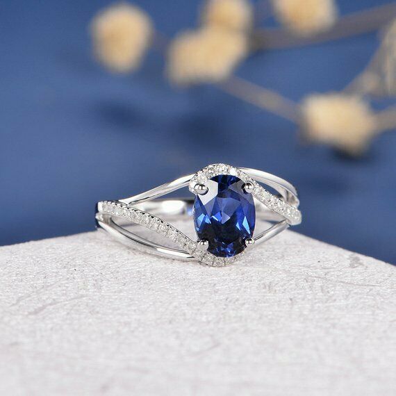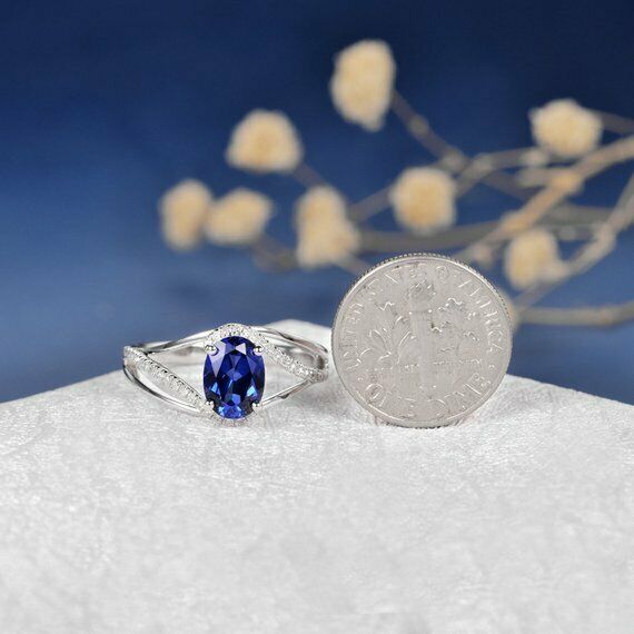 1.6ct Oval Cut Blue Sapphire Engagement Ring 14k White Gold Finish Split Shank