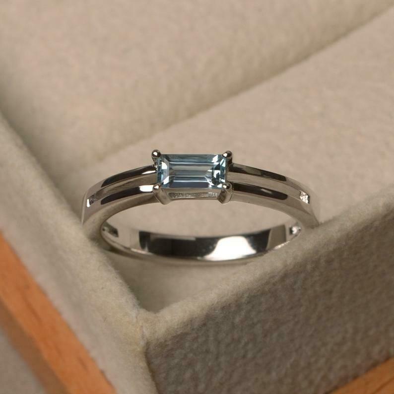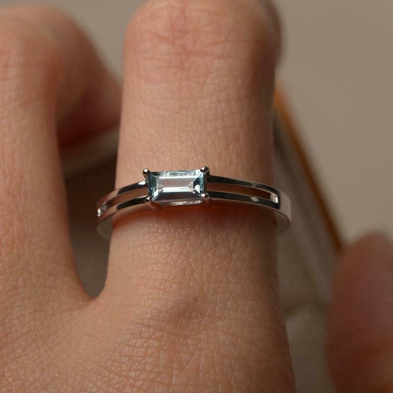 1ct Baguette Cut Blue Aquamarine Solitaire Split Band Ring 14k White Gold Finish