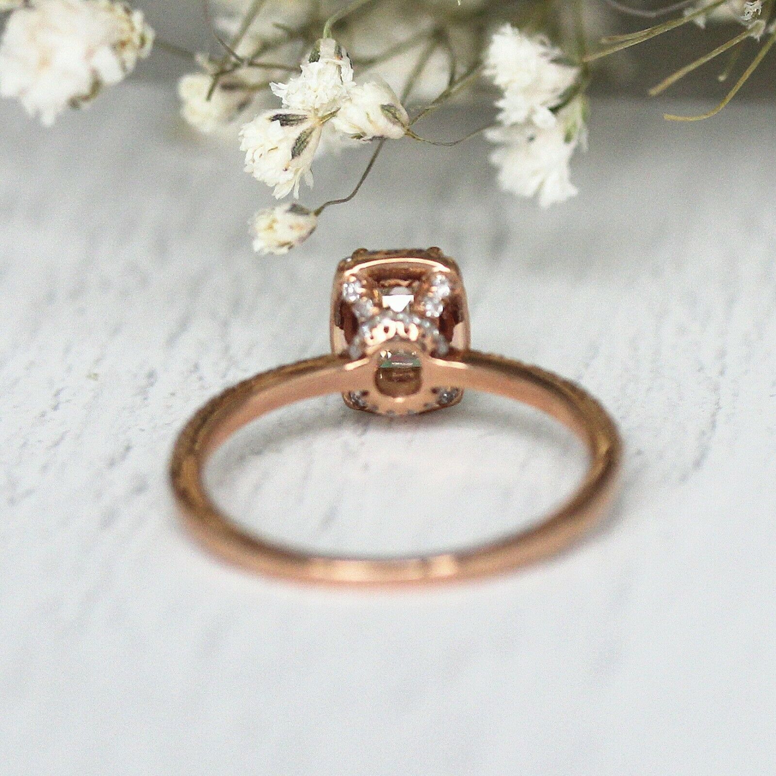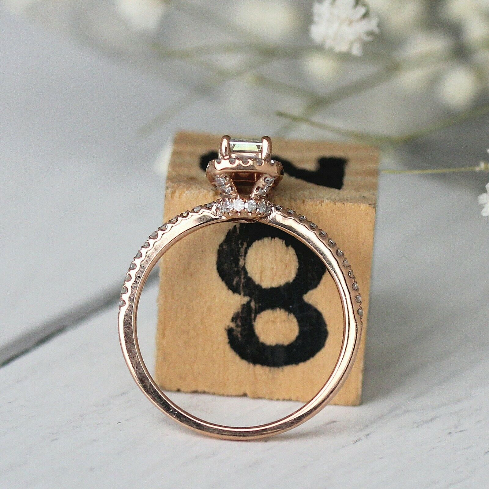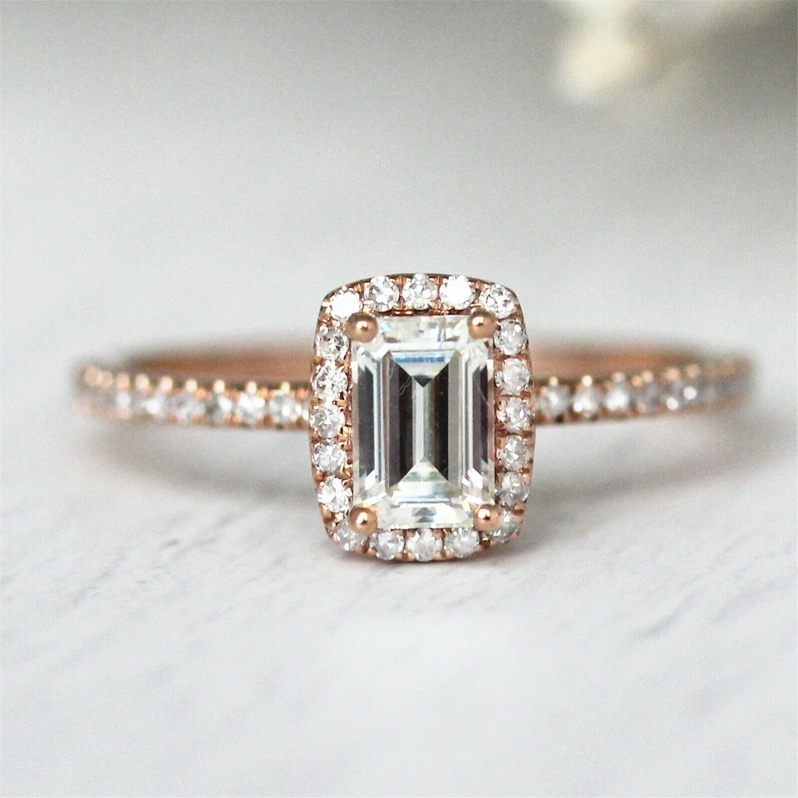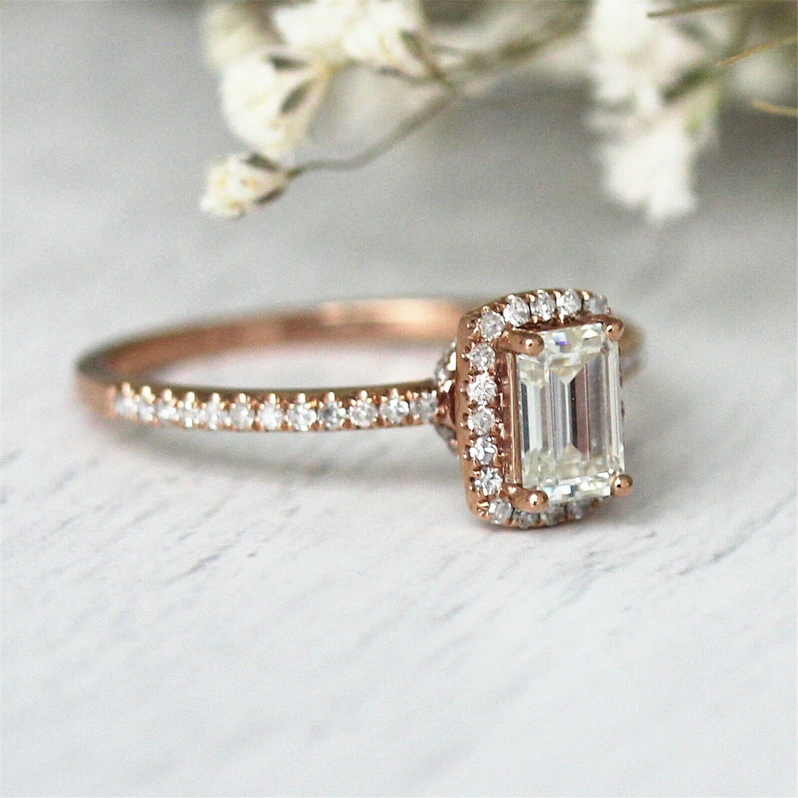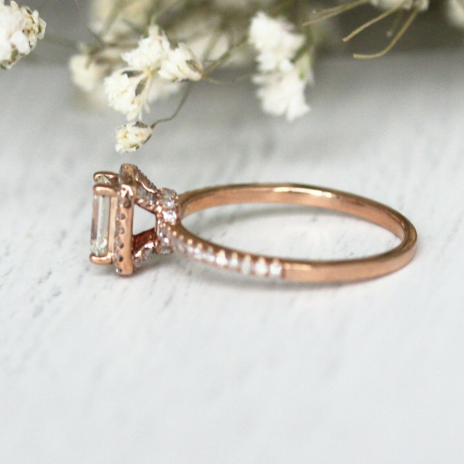 1Ct Emerald Cut DVVS1 Diamond High Set Halo Engagement Ring 14K Rose Gold Finish