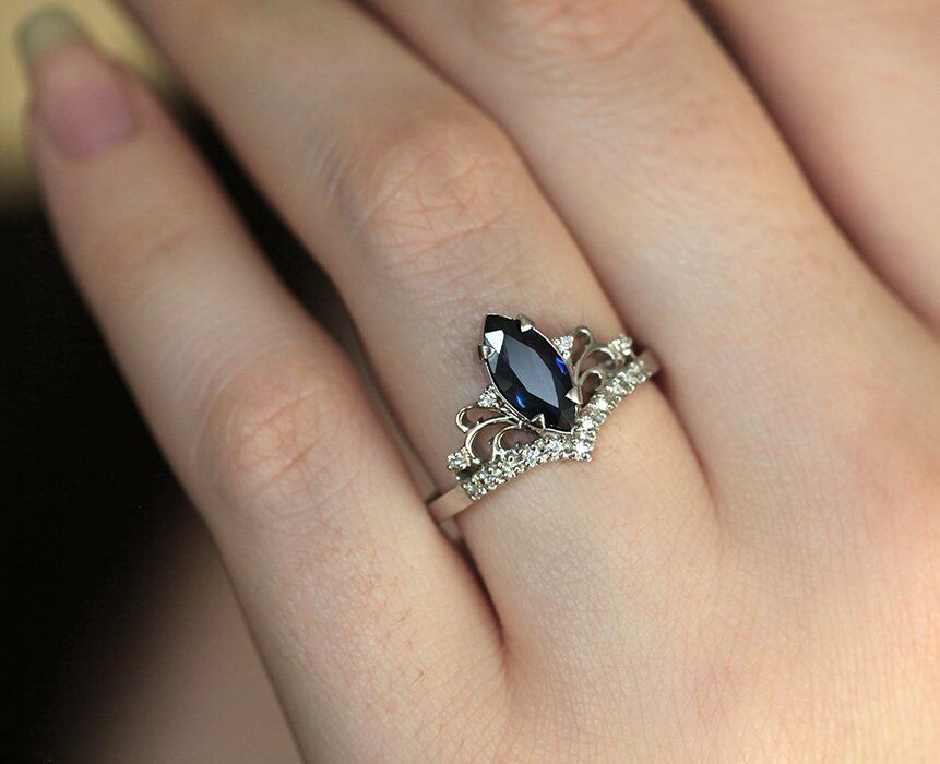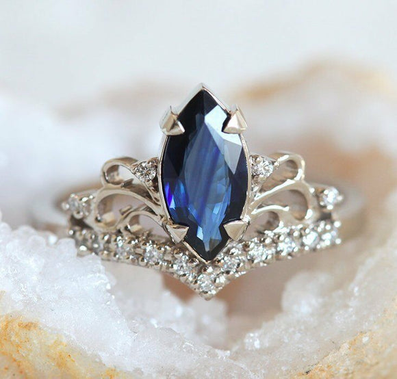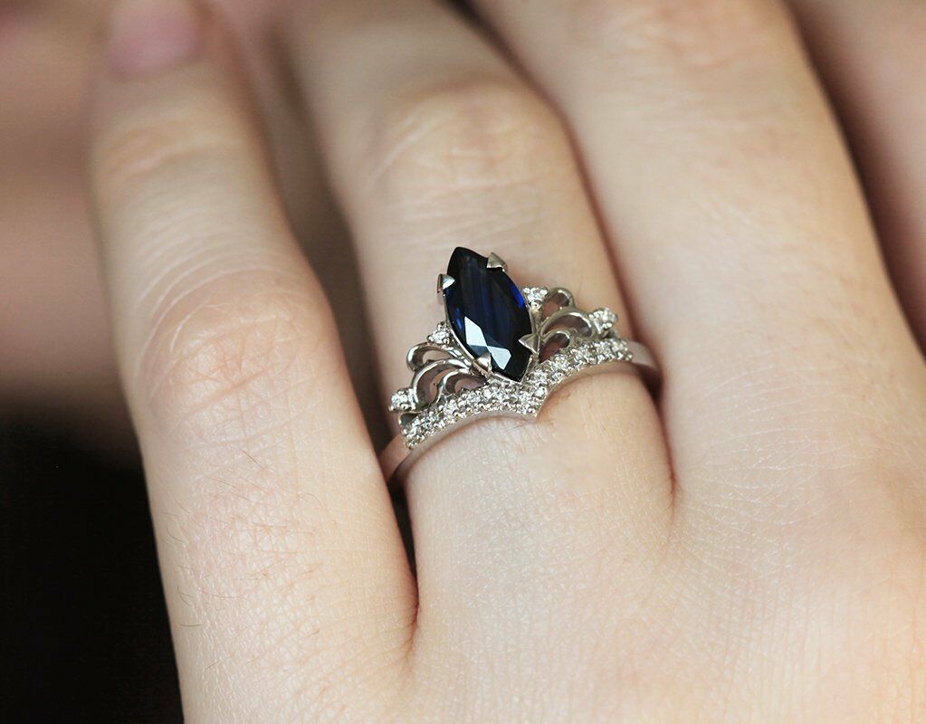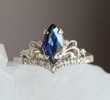 1ct Marquise Cut Blue Sapphire Crown Women Engagement Ring 14k White Gold Finish