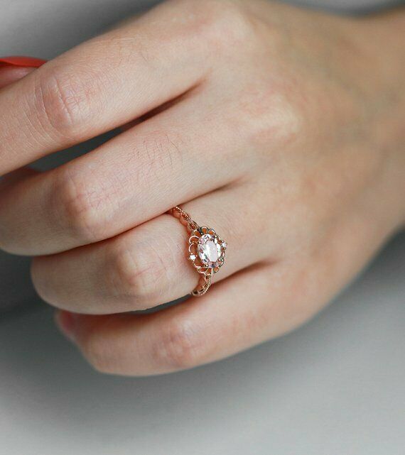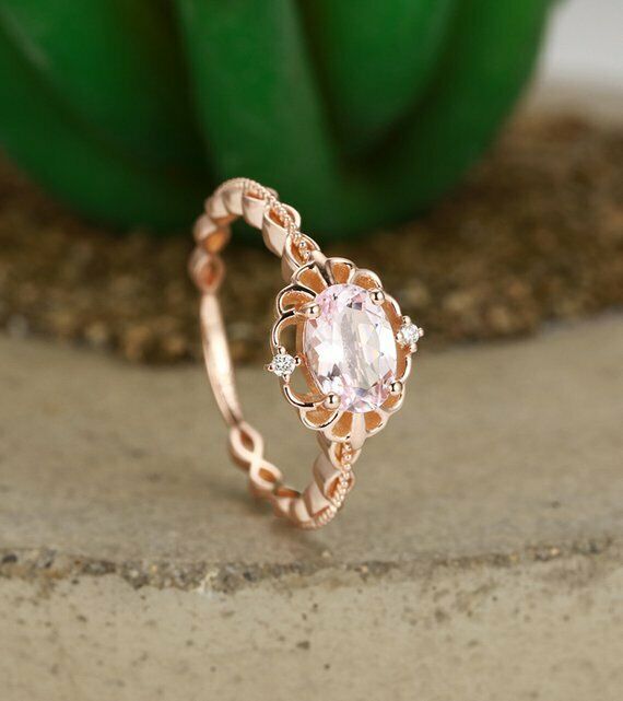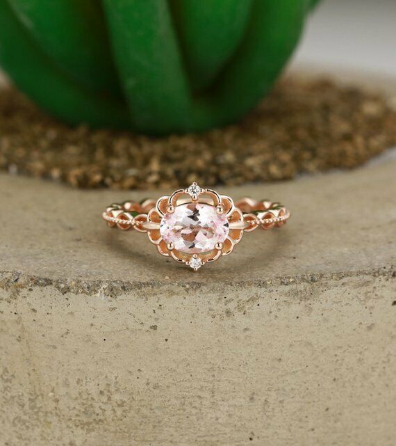 1ct Oval Cut Peach Morganite Engagement Ring 14k Rose Gold Over Floral Solitaire