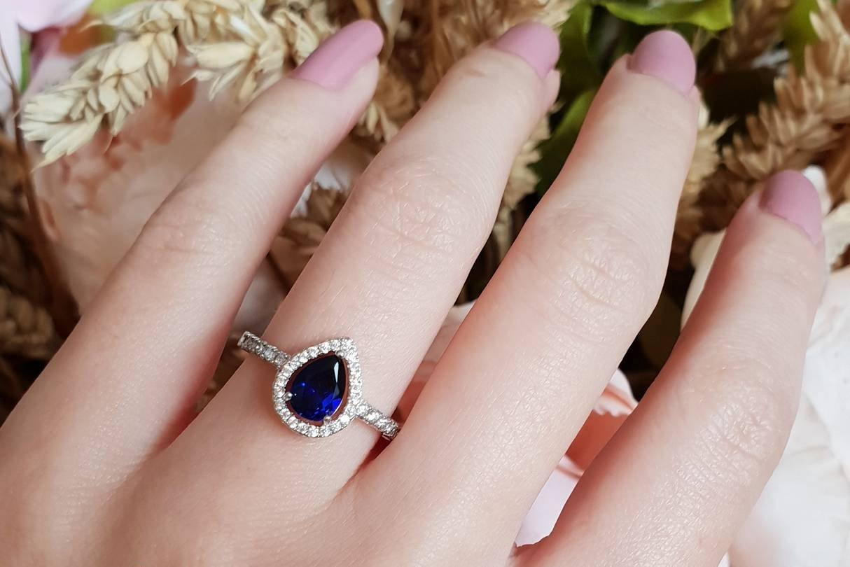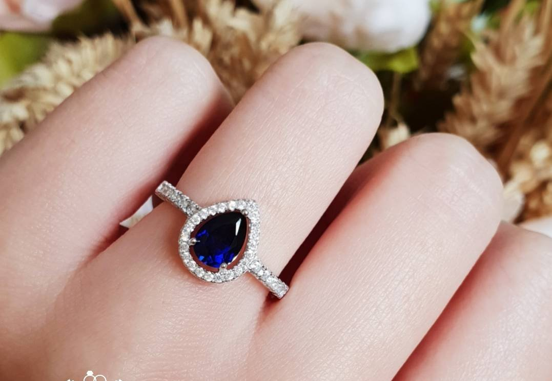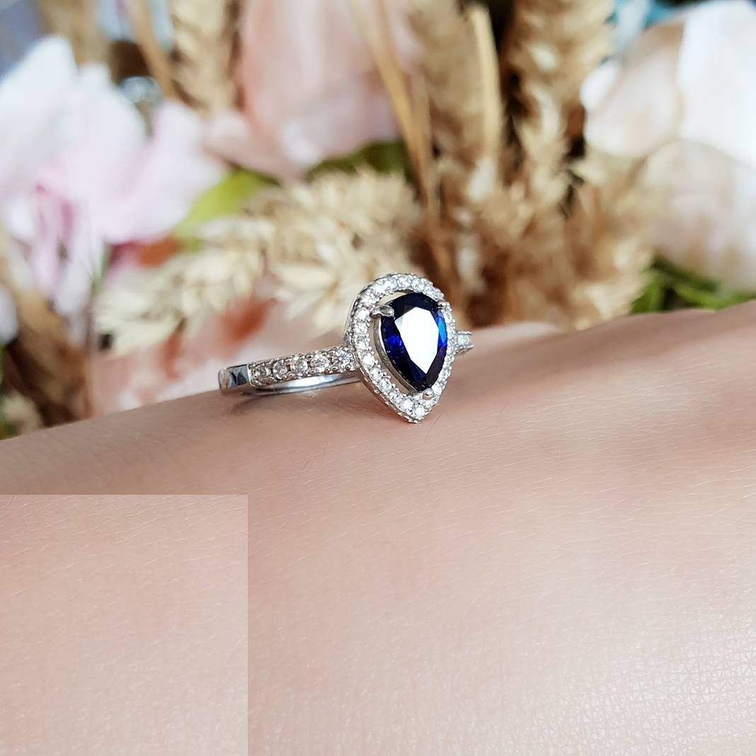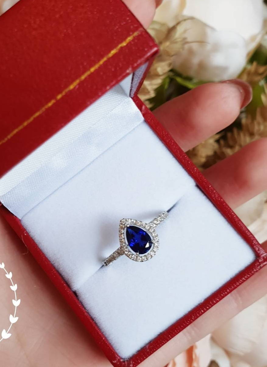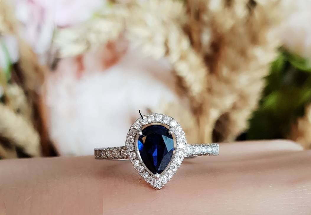 1ct Pear Cut Blue Sapphire Engagement Ring 14k White Gold Finish Halo Teardrop