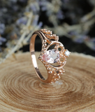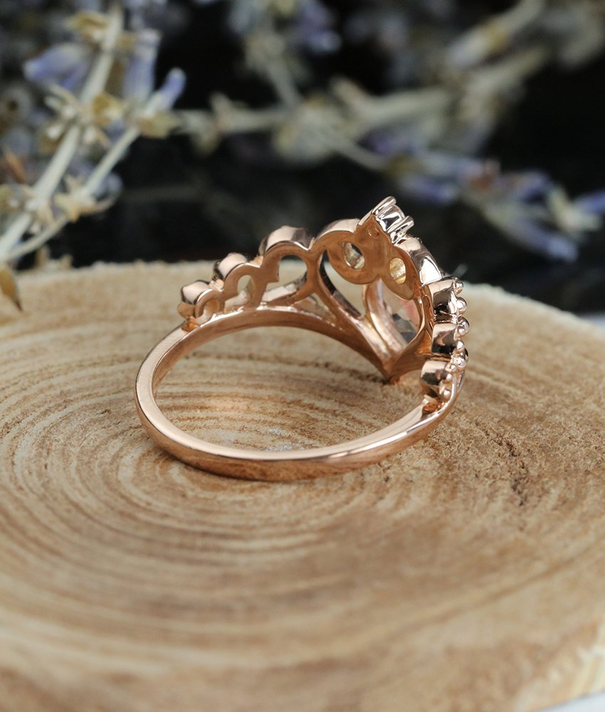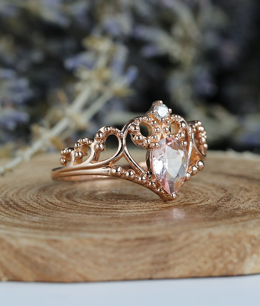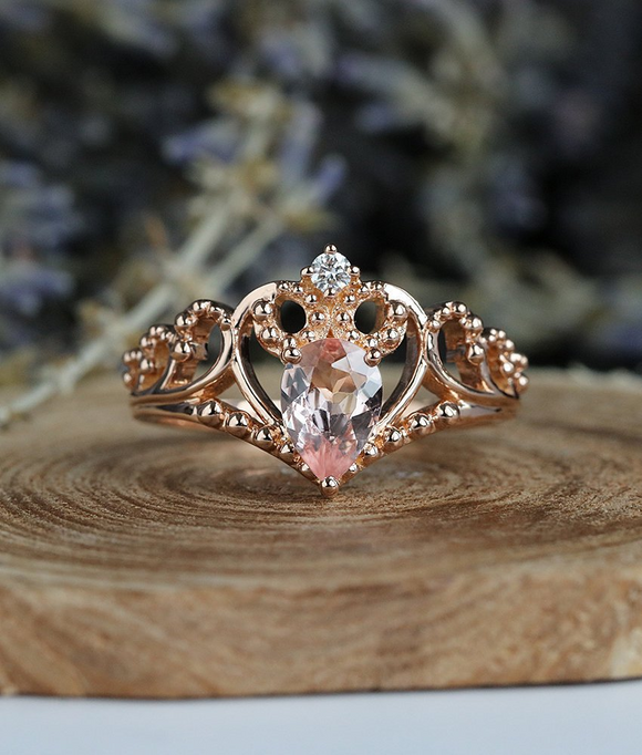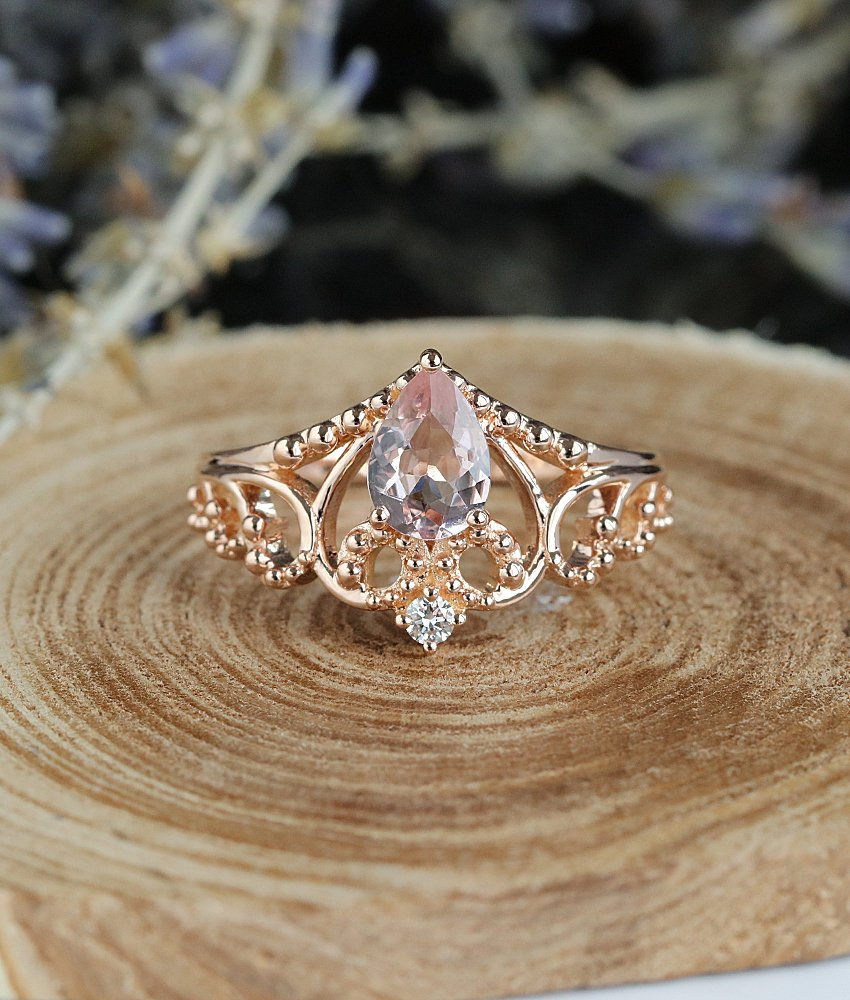 1ct Pear Cut Peach Morganite Engagement Ring 14k Rose Gold Finish Crown Milgrain