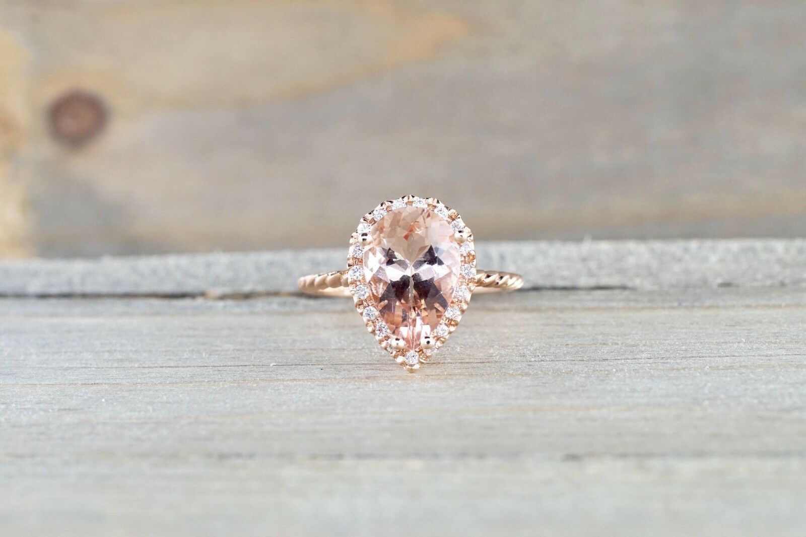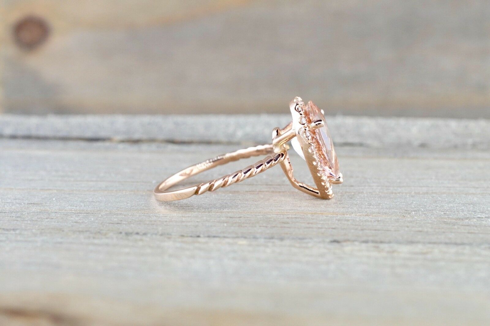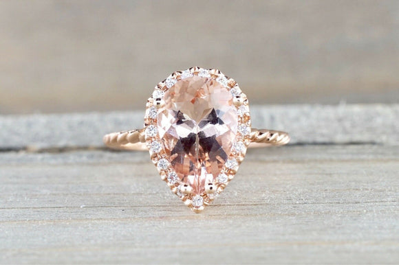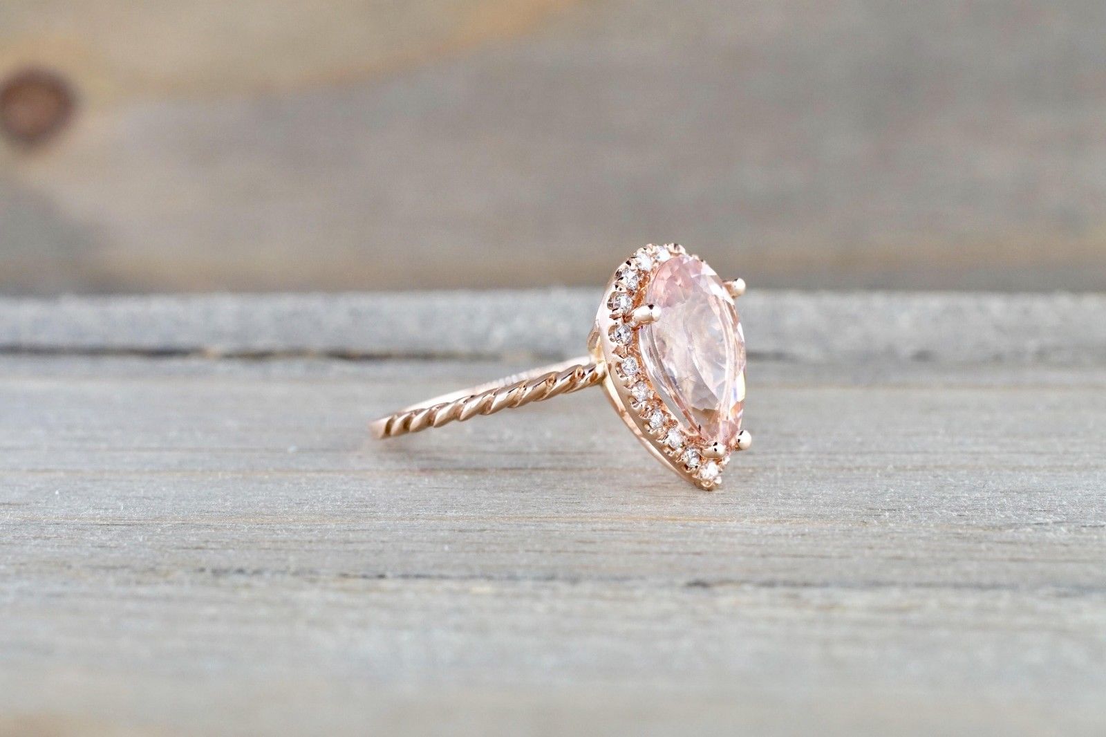 1ct Pear Cut Peach Morganite Halo Solitaire Engagement Ring 14k Rose Gold Finish