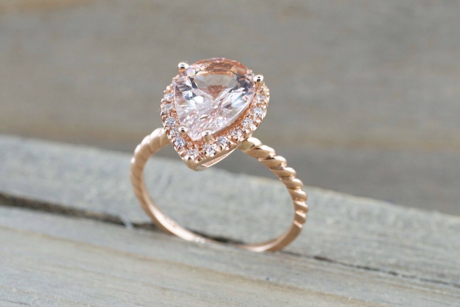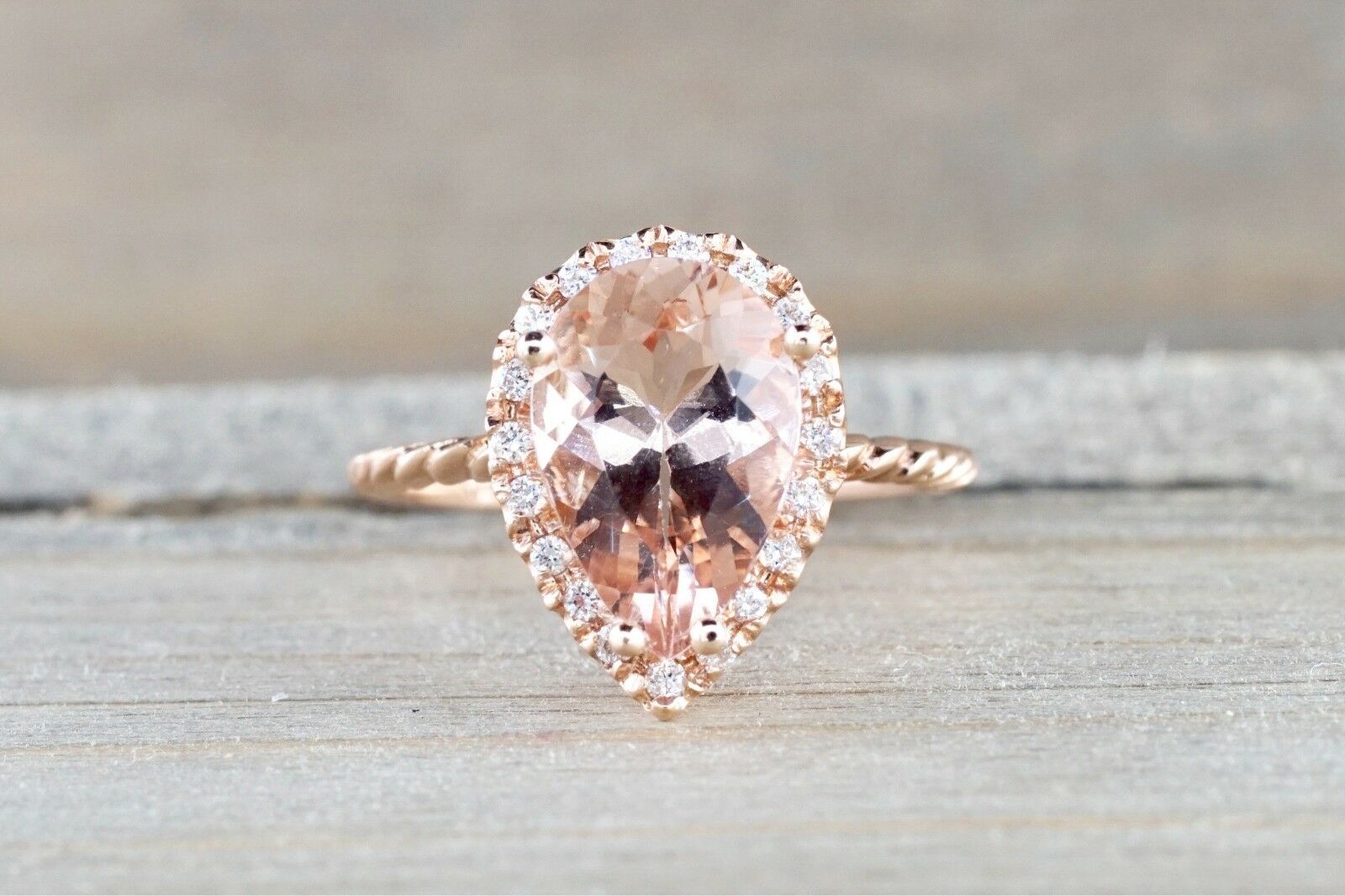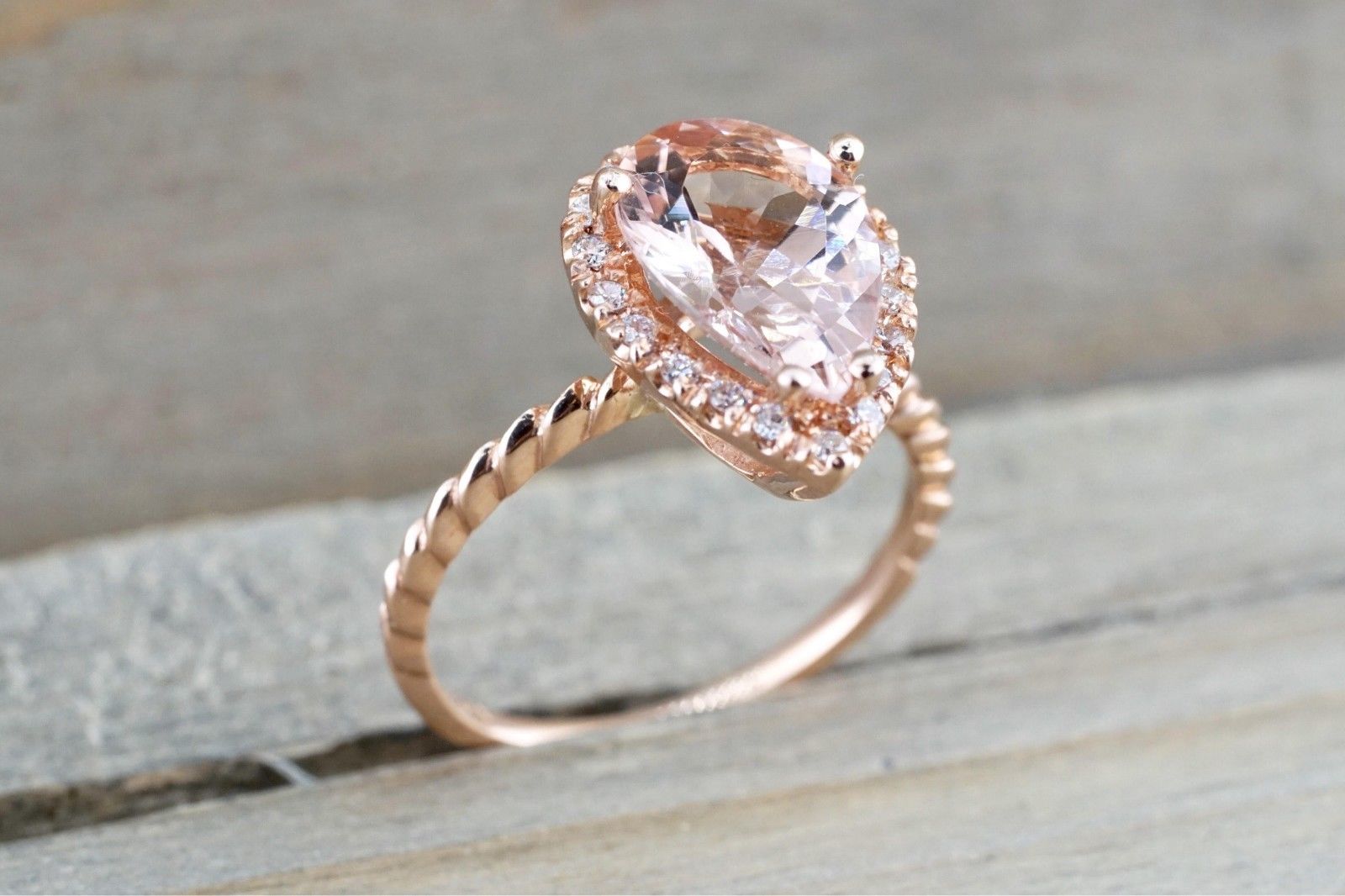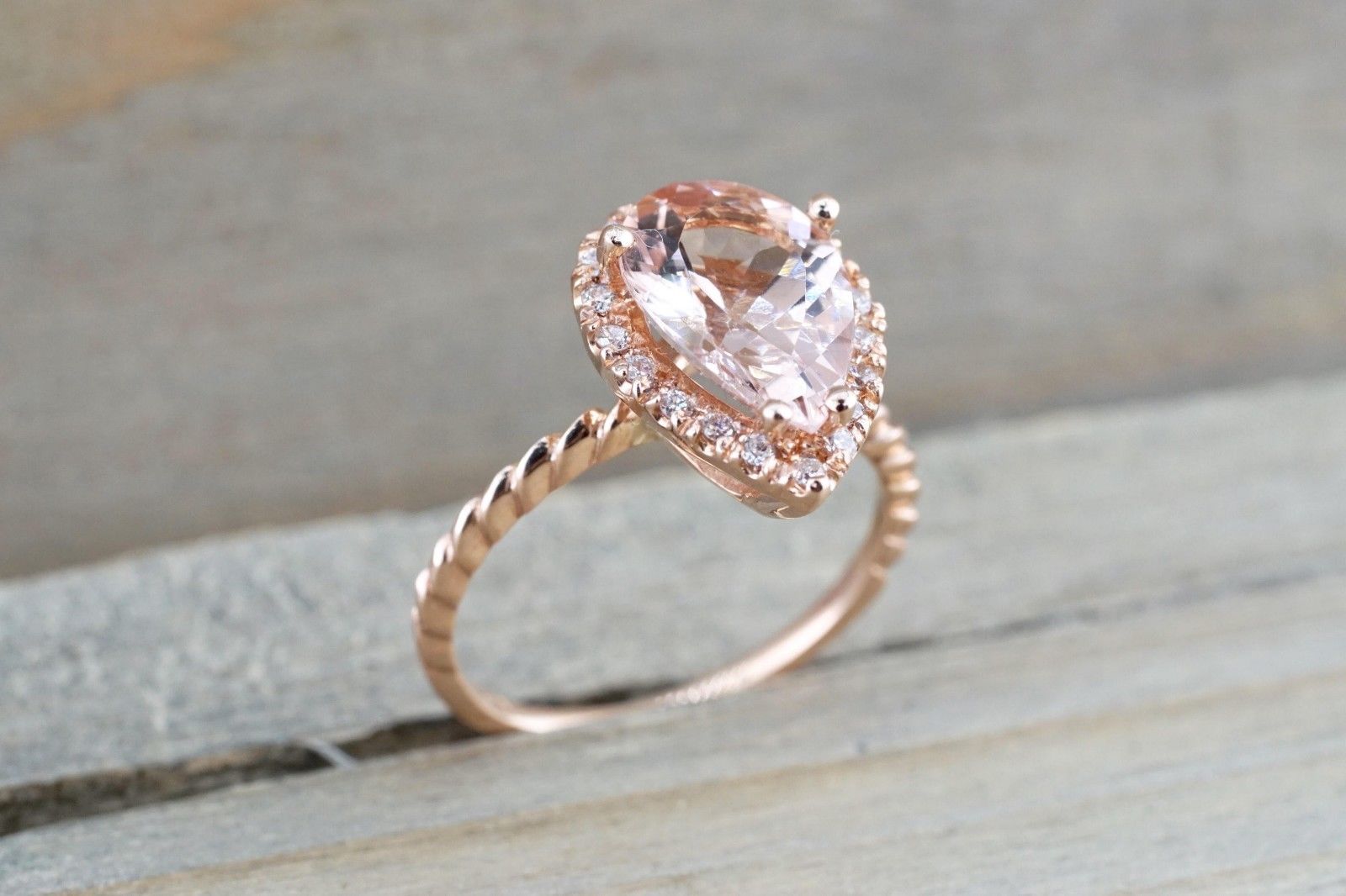 1ct Pear Cut Peach Morganite Halo Solitaire Engagement Ring 14k Rose Gold Finish