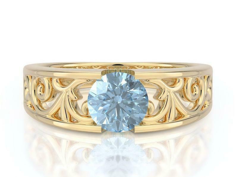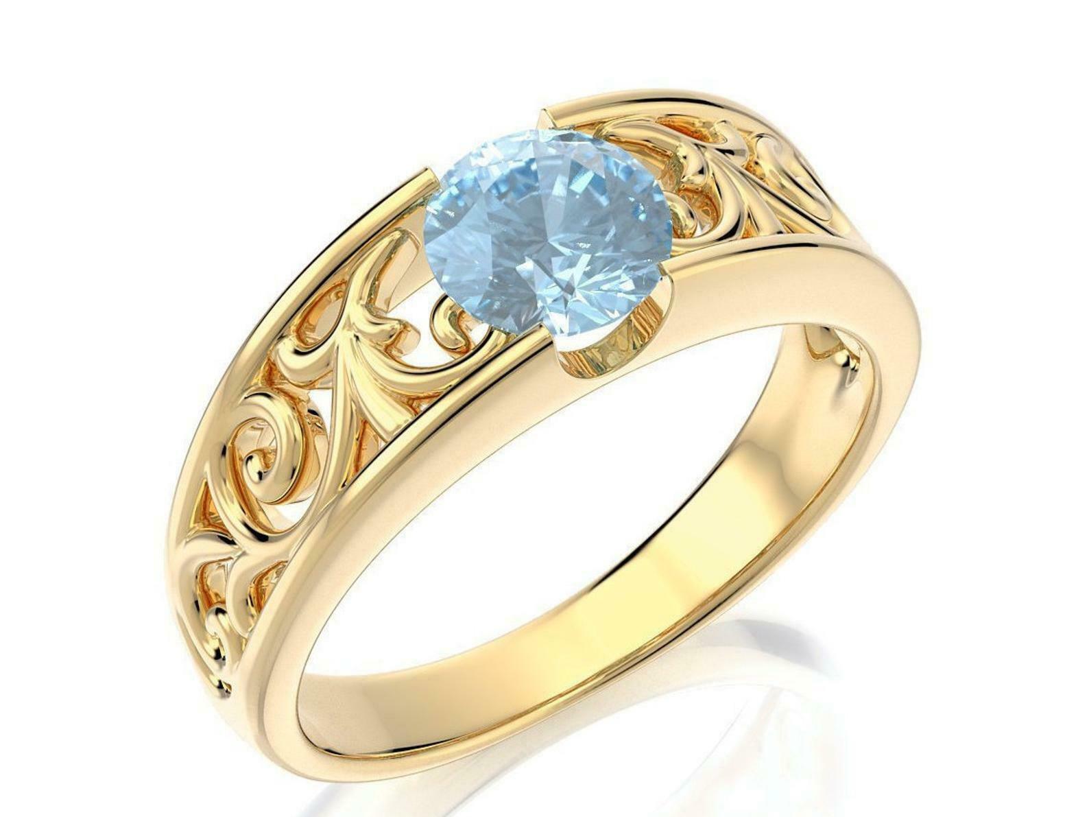 1ct Round Cut Blue Aquamarine Vintage Filigree Engagement Ring 14k Yellow Gold Over