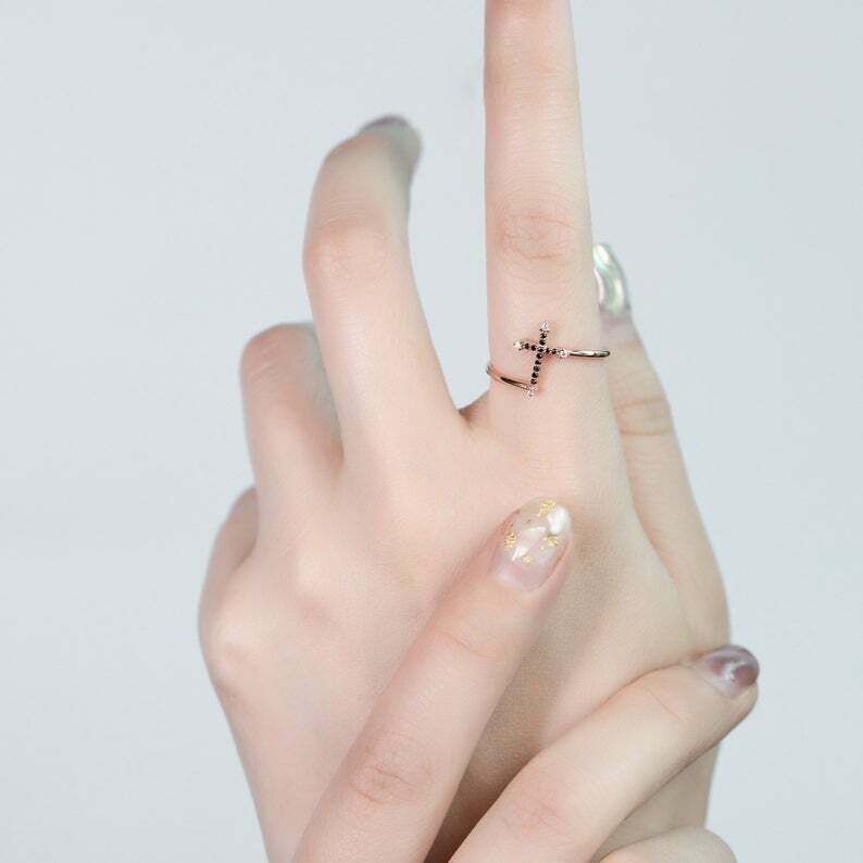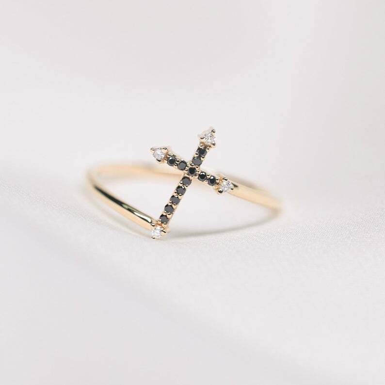 1ct Round Cut Black Diamond Christ Cross Minimalist Ring 14k Yellow Gold Finish