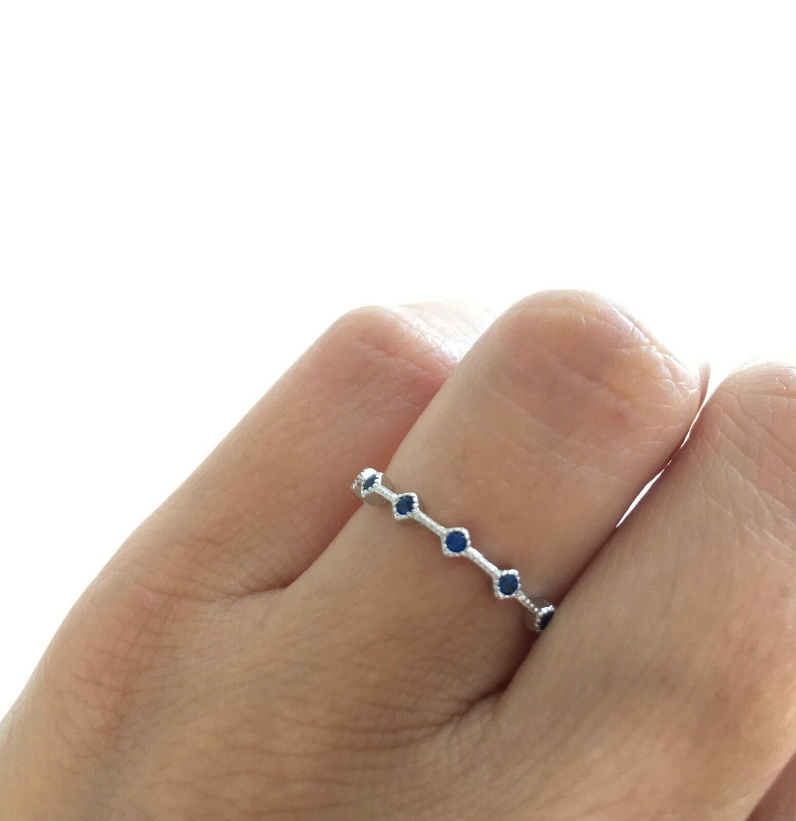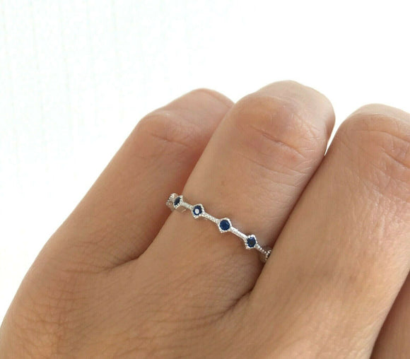 1Ct Round Cut Blue Sapphire Dainty Minimalist Wedding Band 14K White Gold Finish