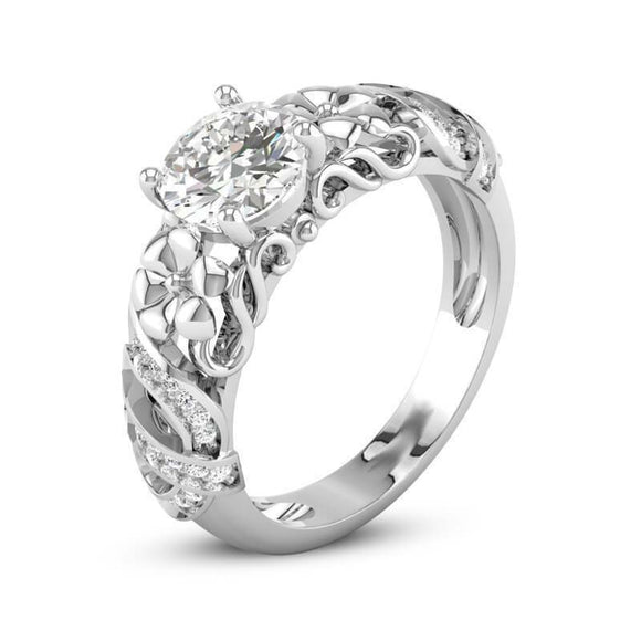 1Ct Round Diamond Floral Accent Solitaire Engagement Ring 14K White Gold Finish