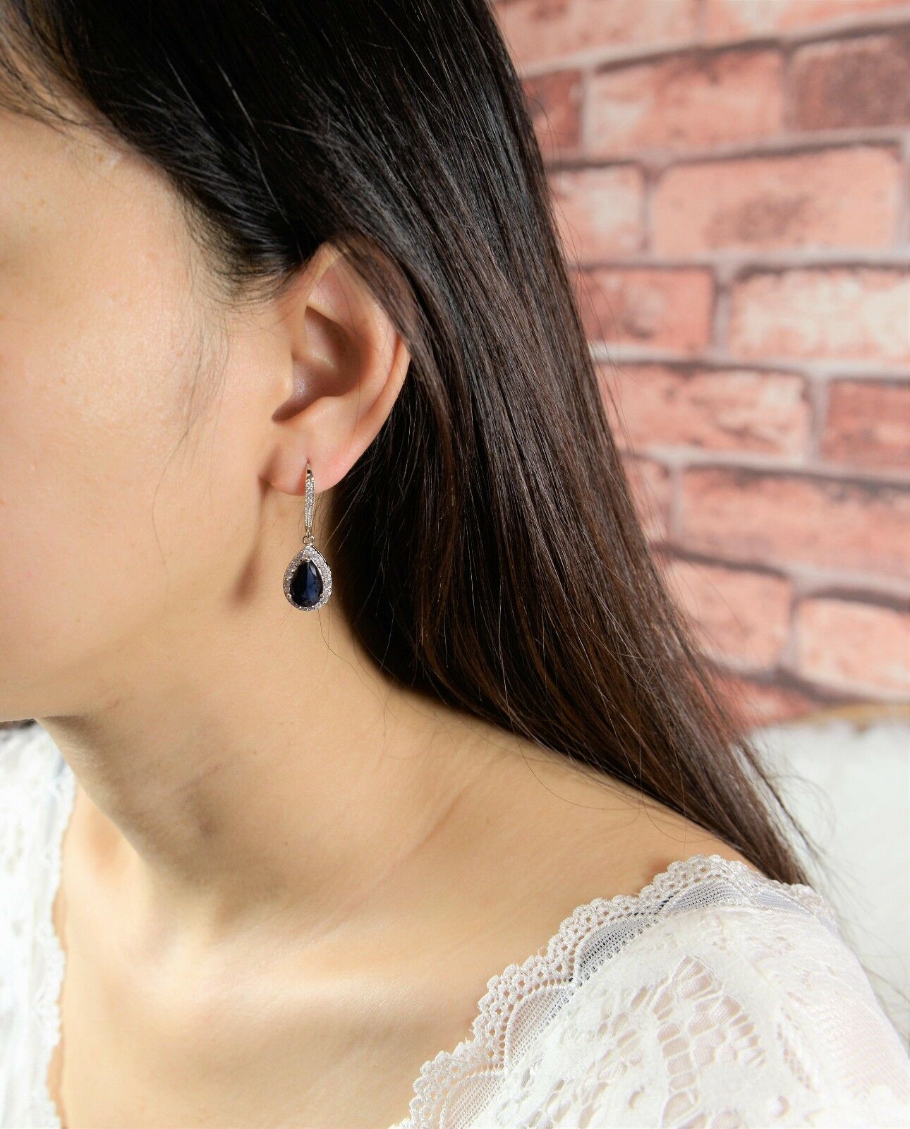 2.5ct Pear Cut Blue Sapphire Halo Tear Rain Dangle Earring 14k White Gold Finish