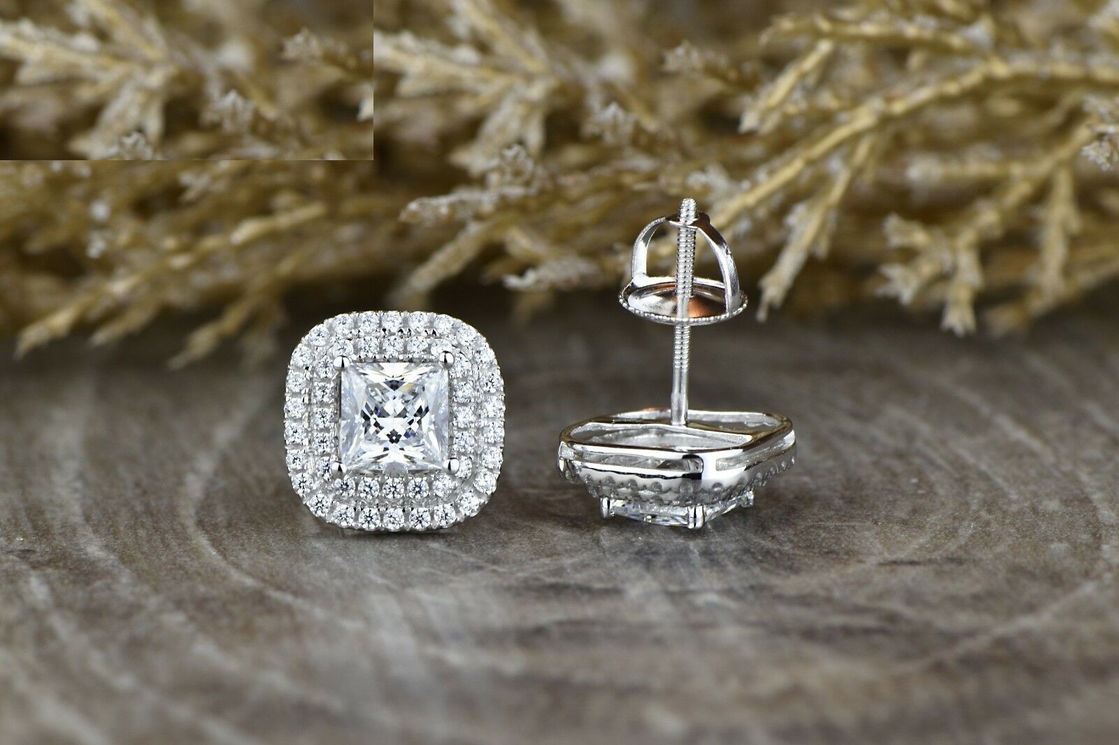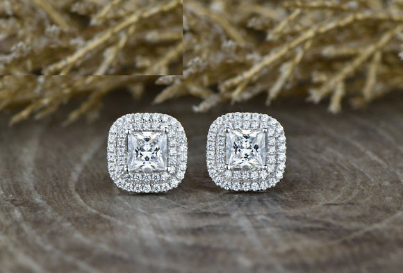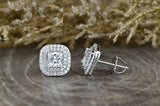2.5ct Princess Cut Diamond Halo Screw Back Stud Earrings 14k White Gold Finish