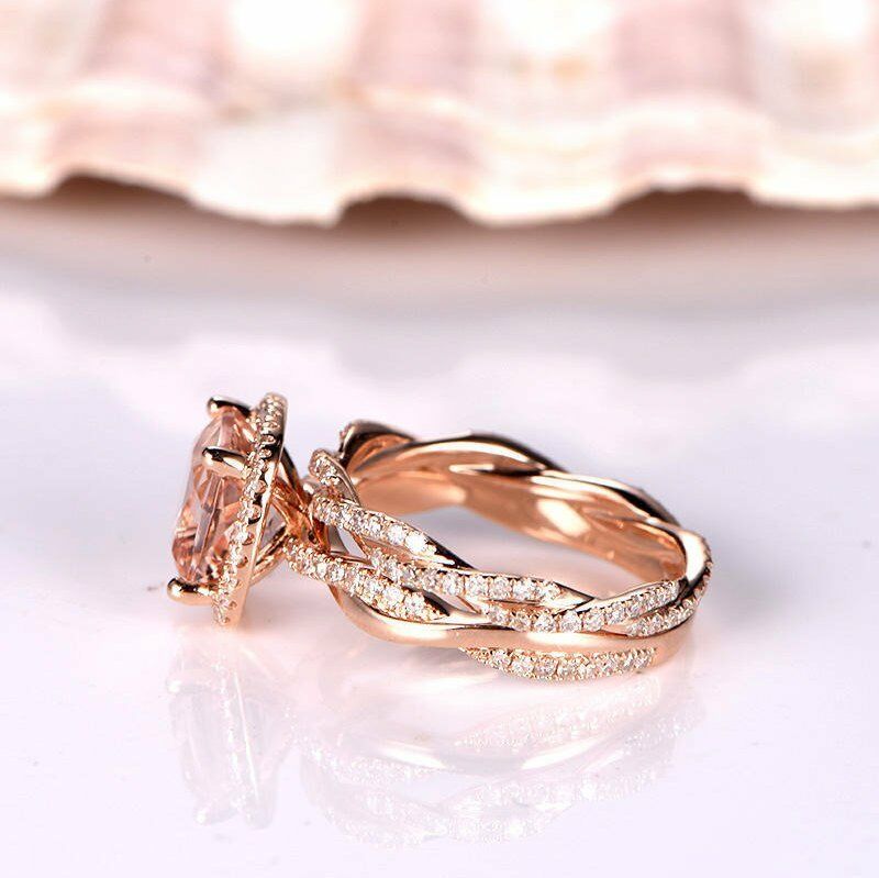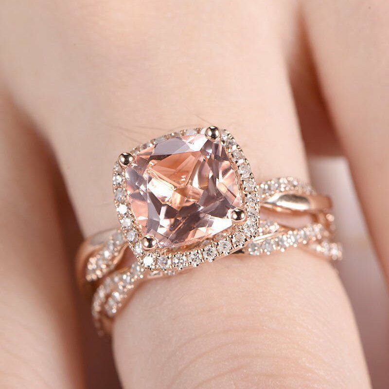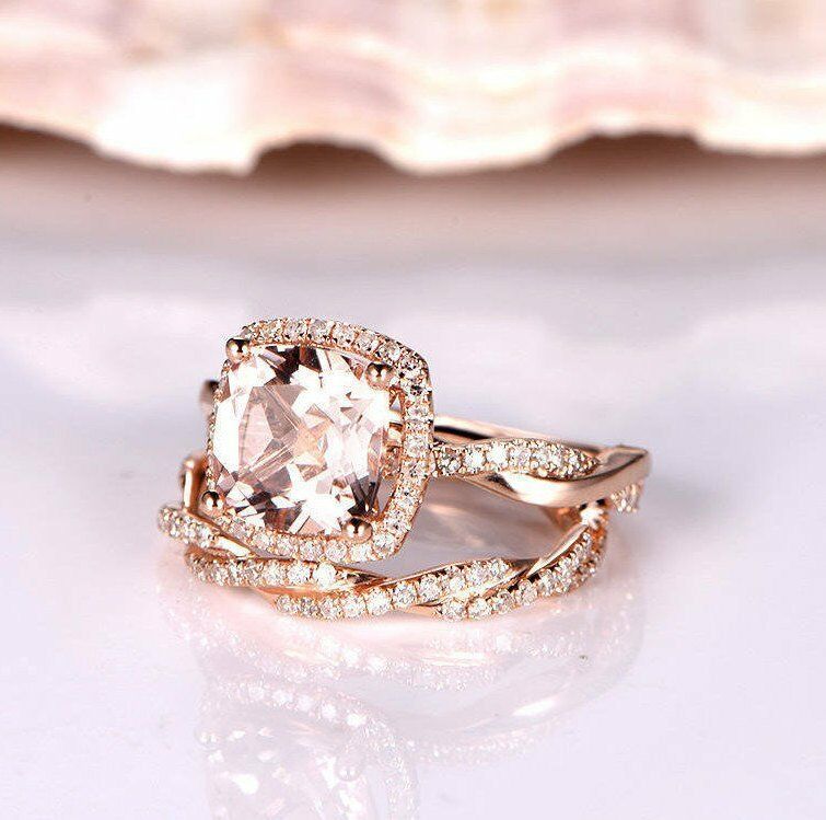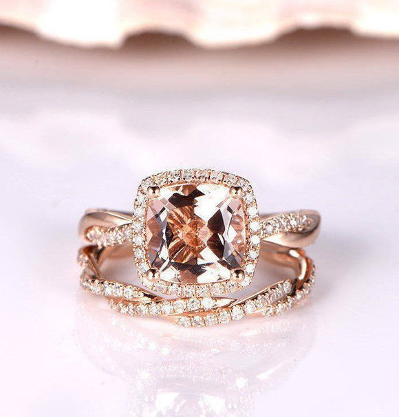 2ct Cushion Cut Peach Morganite Bridal Set Engagement Ring 18k Rose Gold Finish