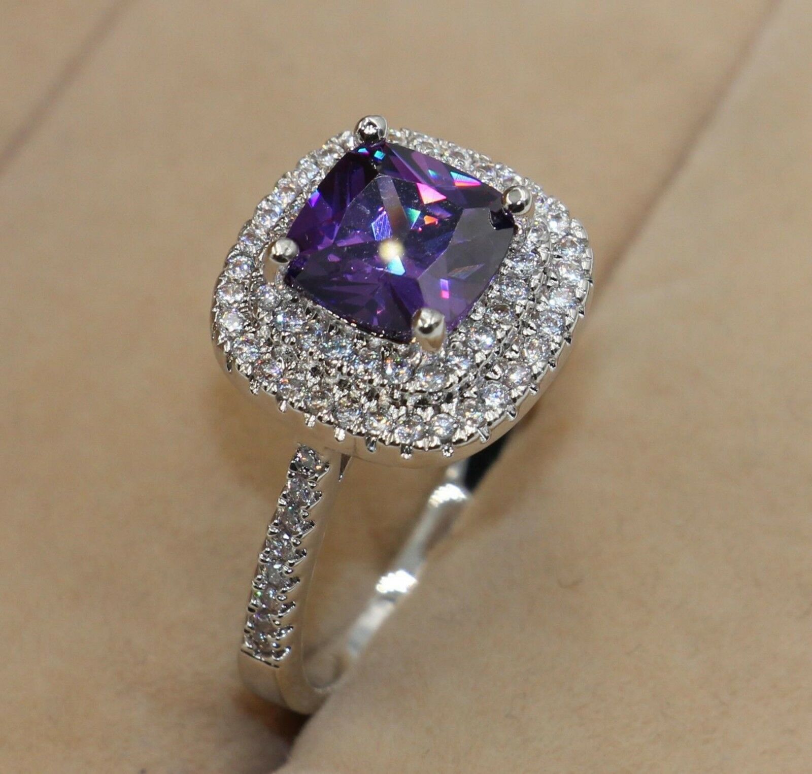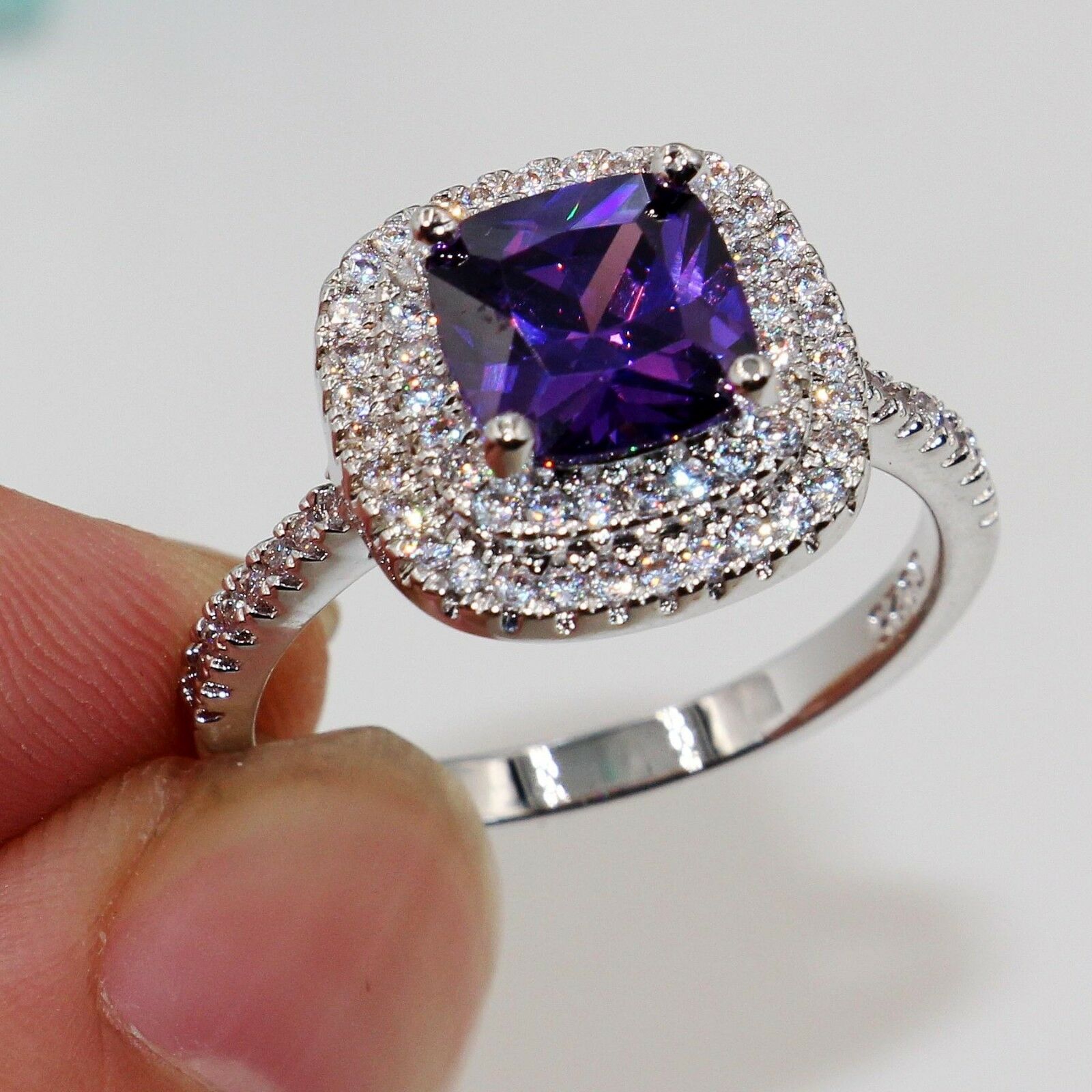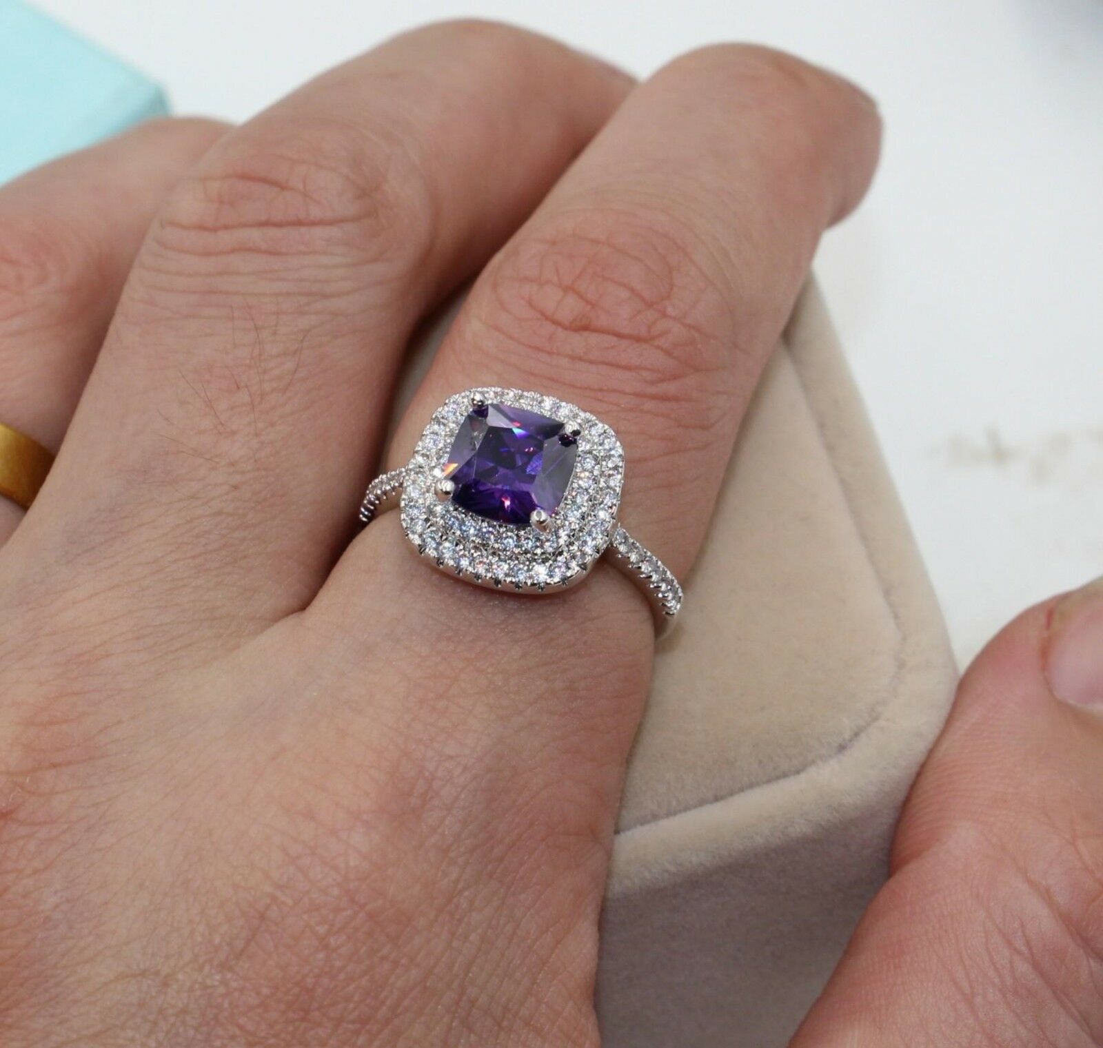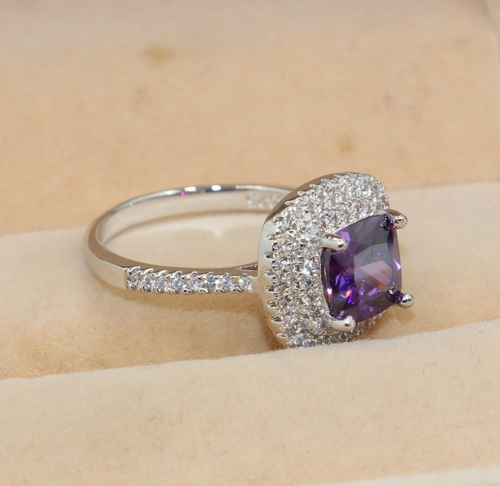 2ct Cushion Cut Purple Amethyst Engagement Ring 14k White Gold Finish Dual Halo