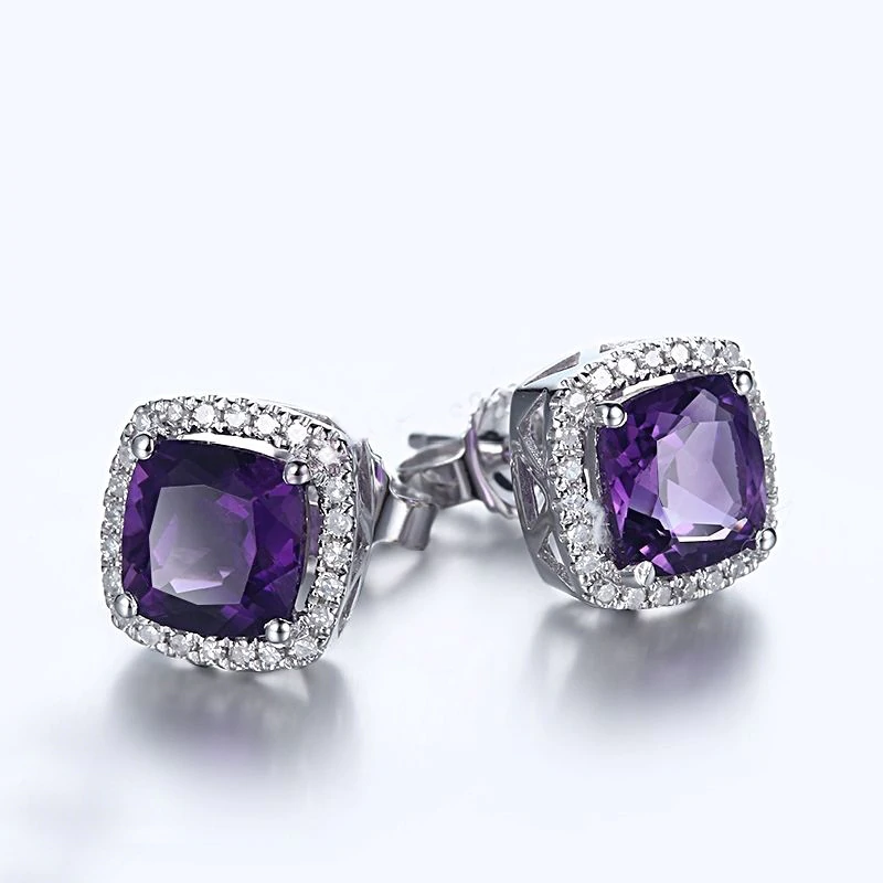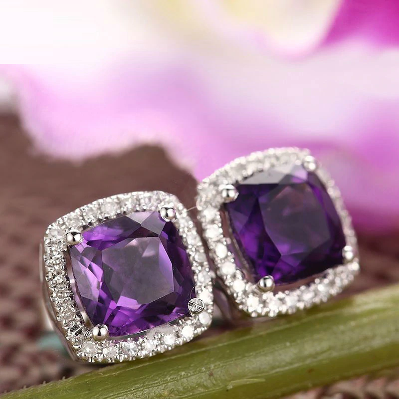 2ct Cushion Cut Purple Amethyst Halo Diamond Stud Earrings 14k White Gold Finish