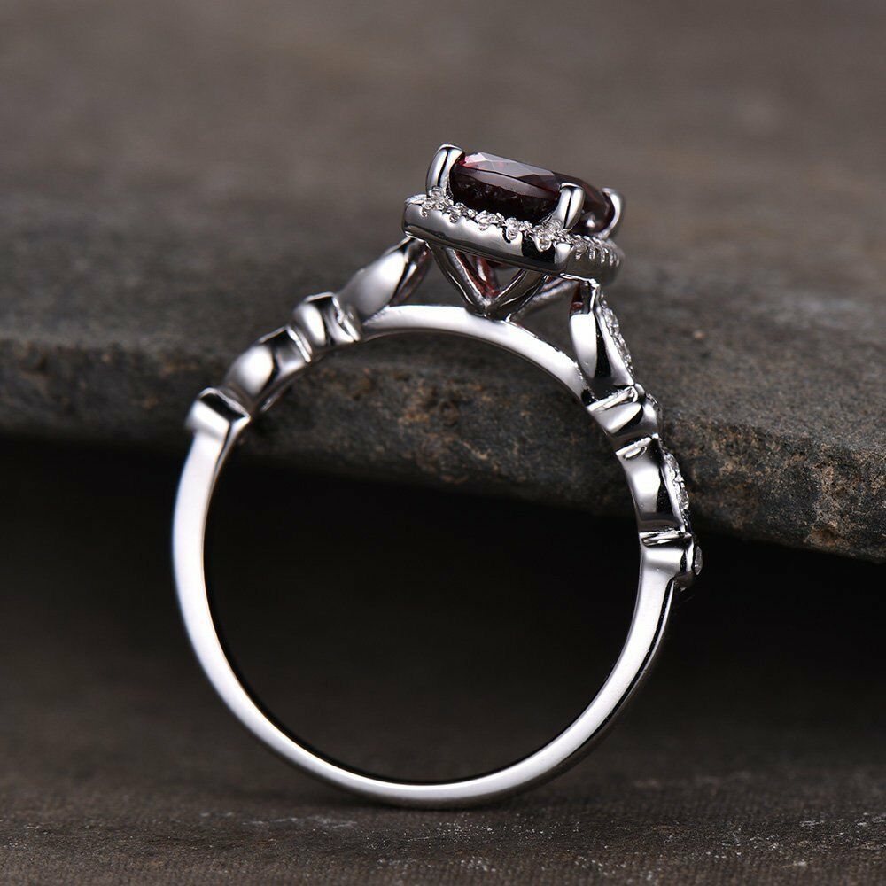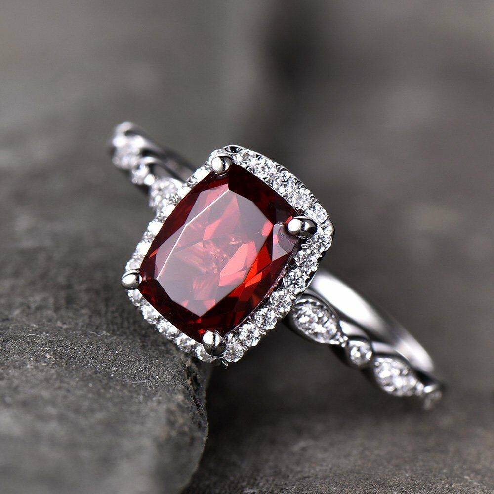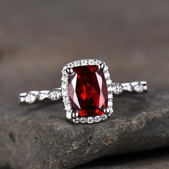 2ct Cushion Cut Red Garnet Halo Solitaire Engagement Ring 14k White Gold Finish