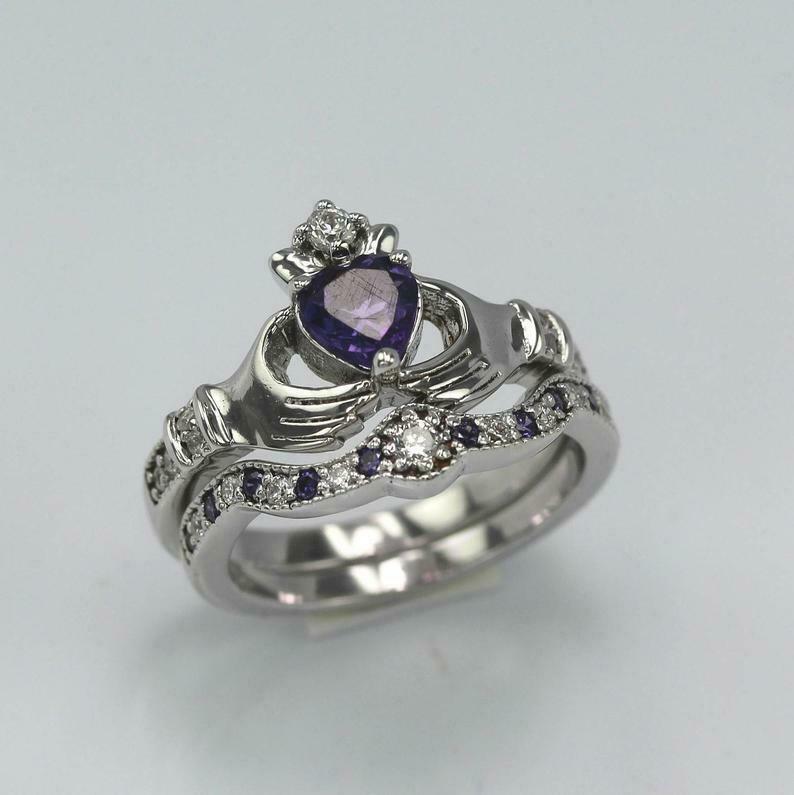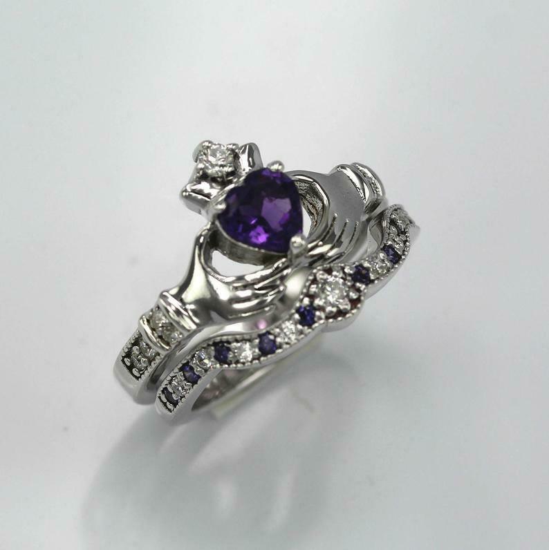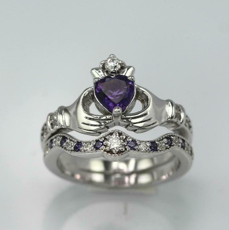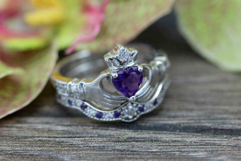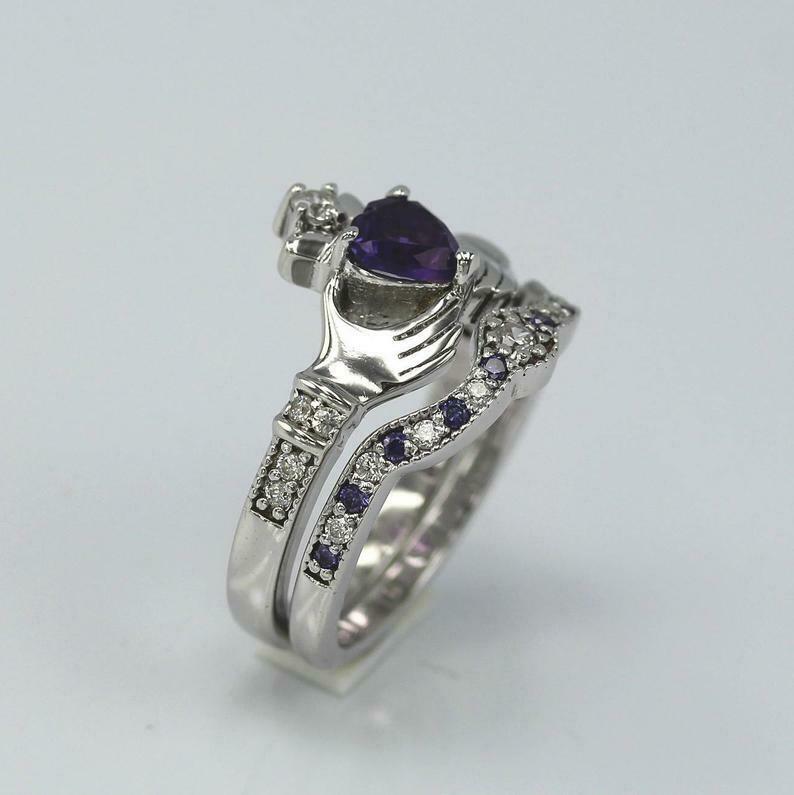 2ct Heart Purple Amethyst Engagement Ring Claddagh Bridal Set 14k WhiteGold Over