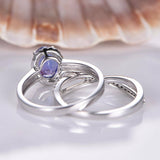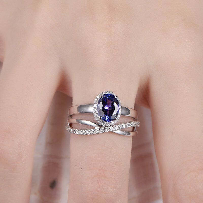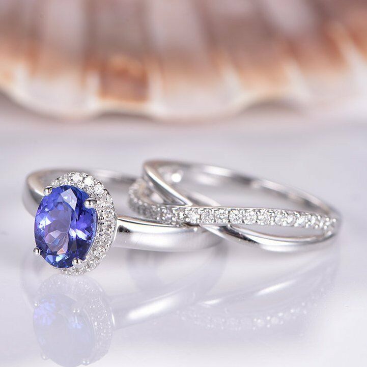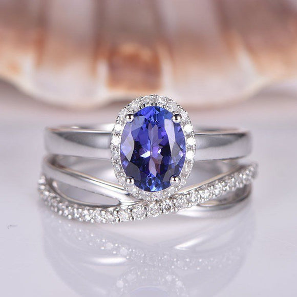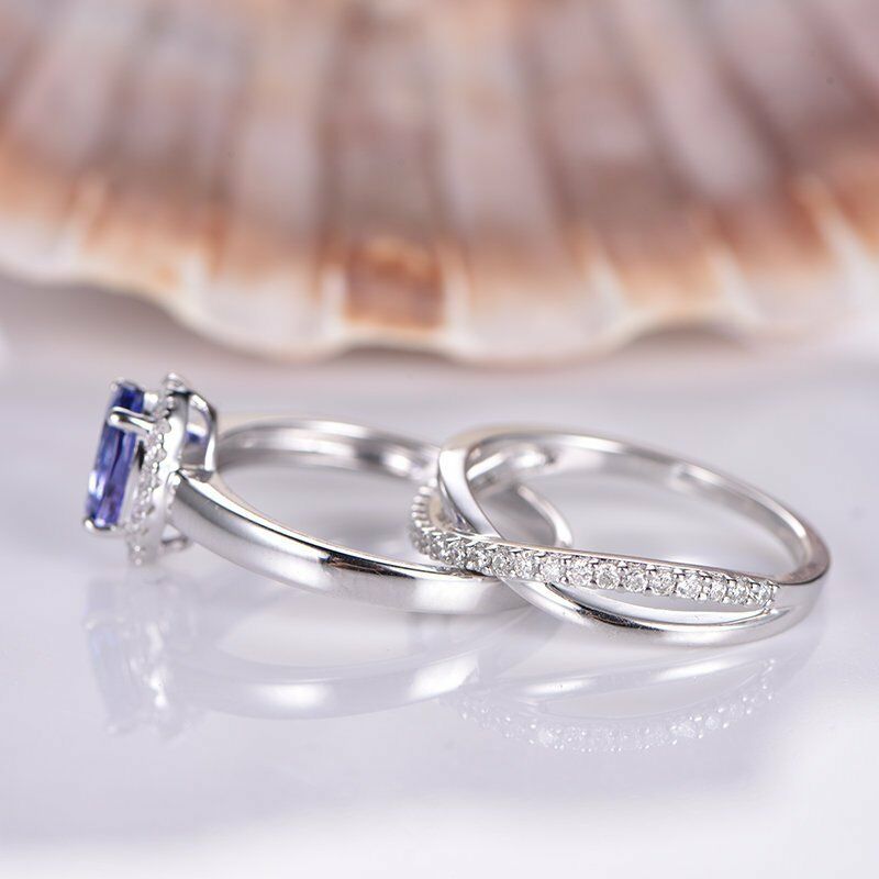 2ct Oval Cut Blue Tanzanite Halo Bridal Set Engagement Ring 14k WhiteGold Finish