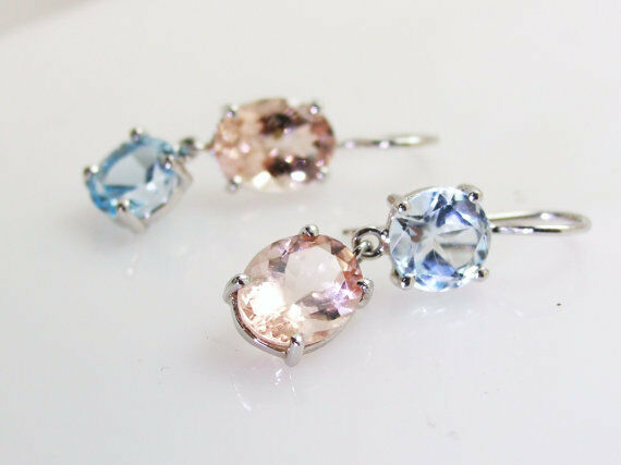 2ct Oval Cut Peach Morganite Blue Topaz Drop Earring Women 14k White Gold Finish