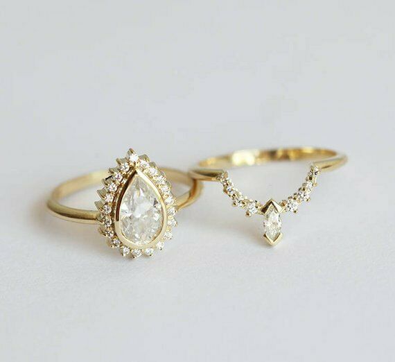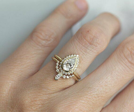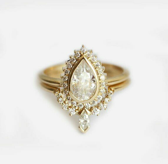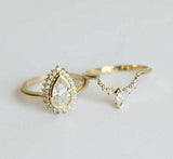 2ct Pear Cut Diamond Engagement Ring 14k Yellow Gold Over Halo Curved Bridal Set