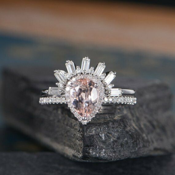 2ct Pear Cut Peach Morganite Engagement Ring 14k White Gold Over Halo Bridal Set