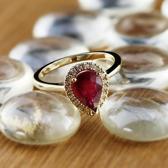 2Ct Pear Cut Pink Ruby Diamond Halo Women Engagement Ring 14K Yellow Gold Finish