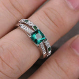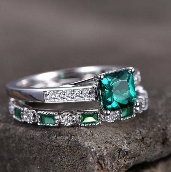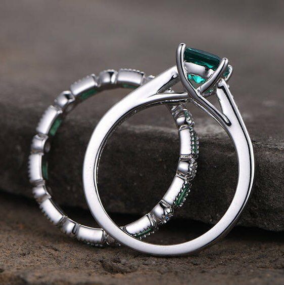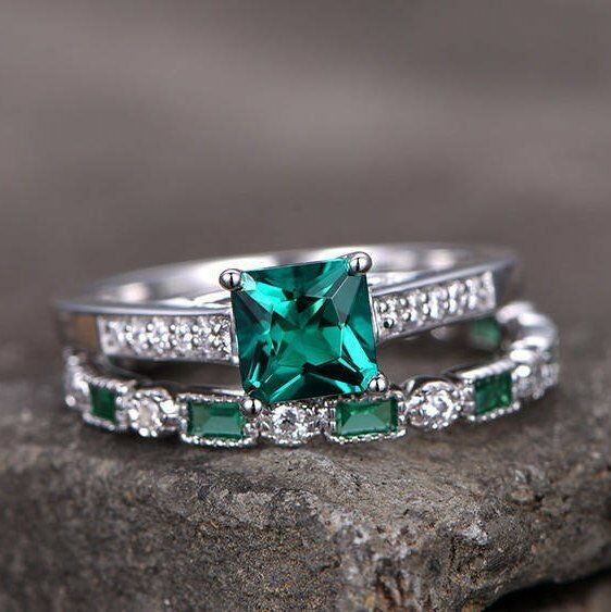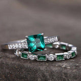2ct Princess Cut Green Emerald Bridal Set Engagement Ring 14k White Gold Finish