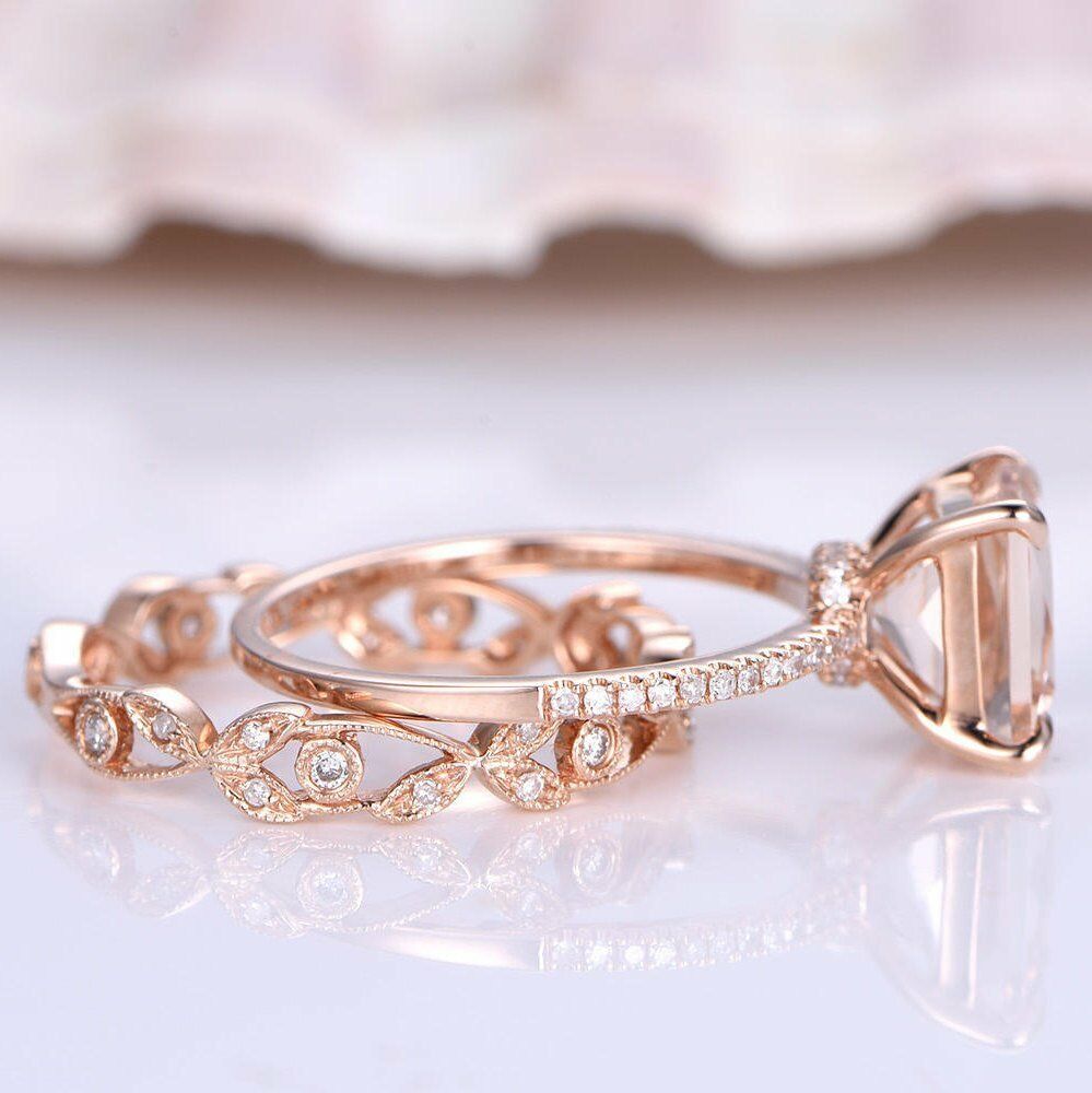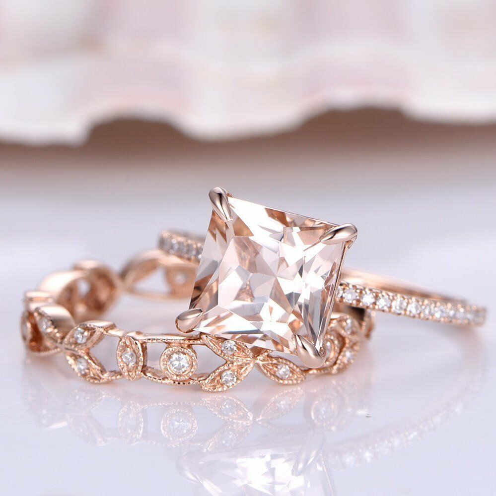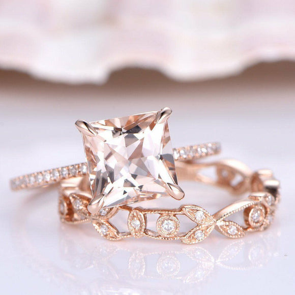 2ct Princess Cut Peach Morganite Bridal Set Engagement Ring 14k Rose Gold Finish