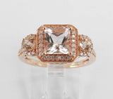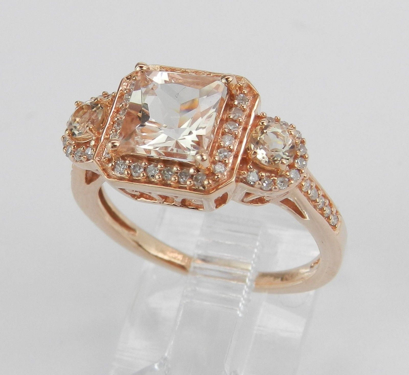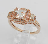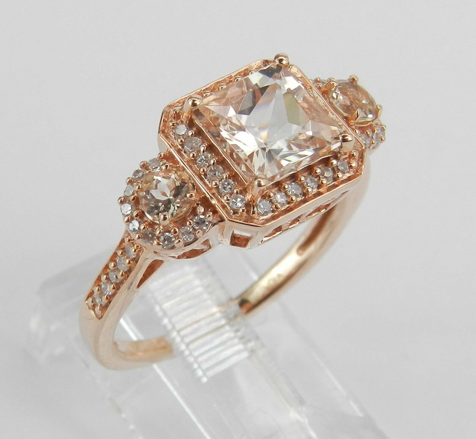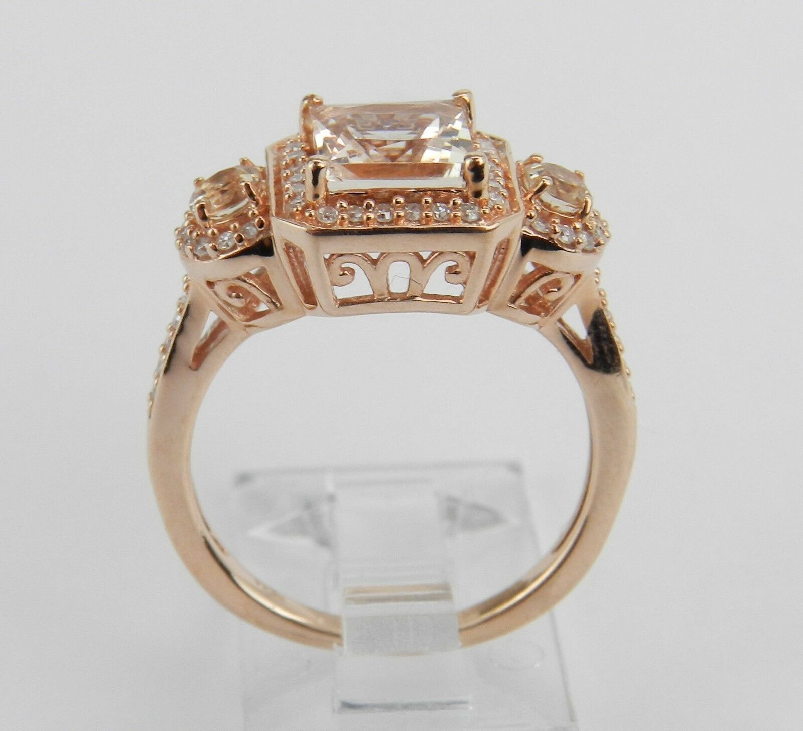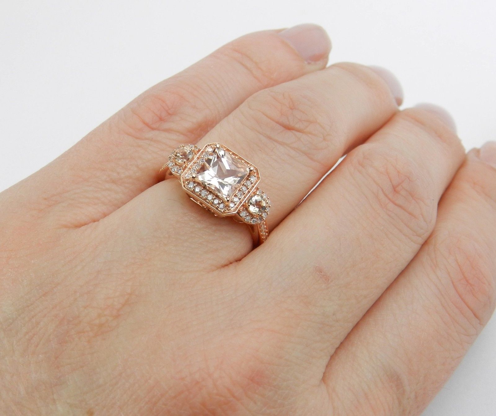 2ct Princess Cut Peach Morganite Trilogy Halo Engagement Ring 14k Rose Gold Over