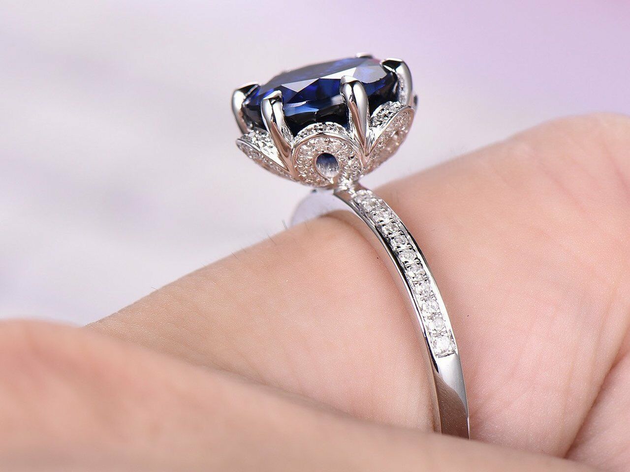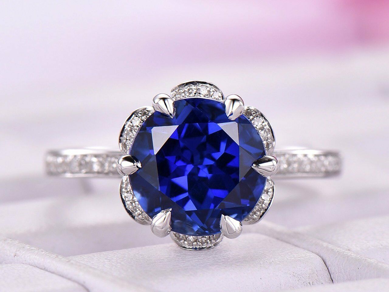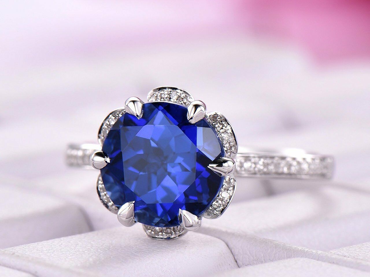 2ct Round Cut Blue Sapphire Engagement Ring 14k White Gold Finish Art Deco Halo