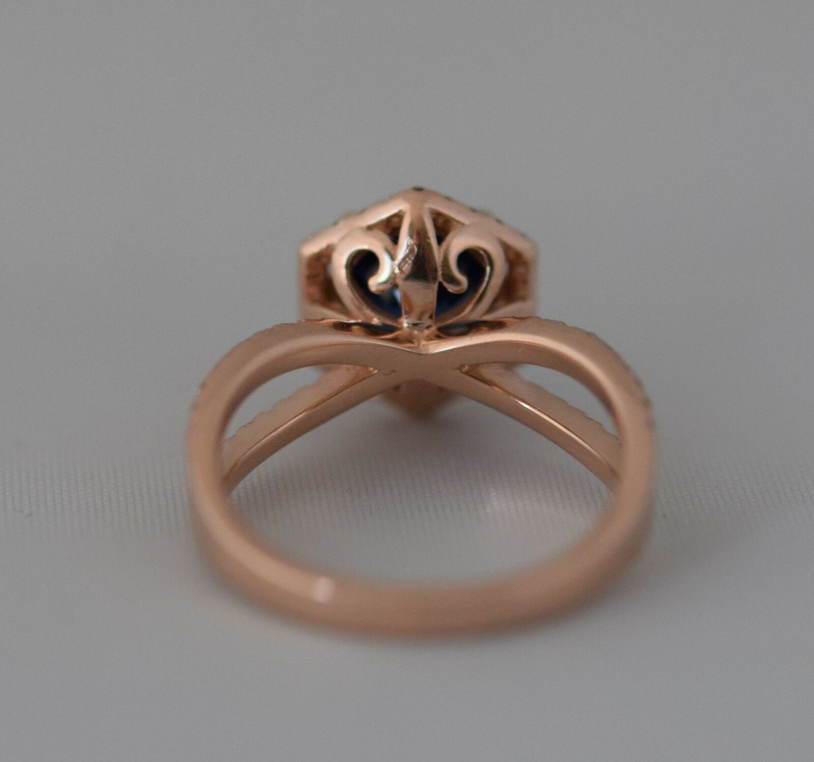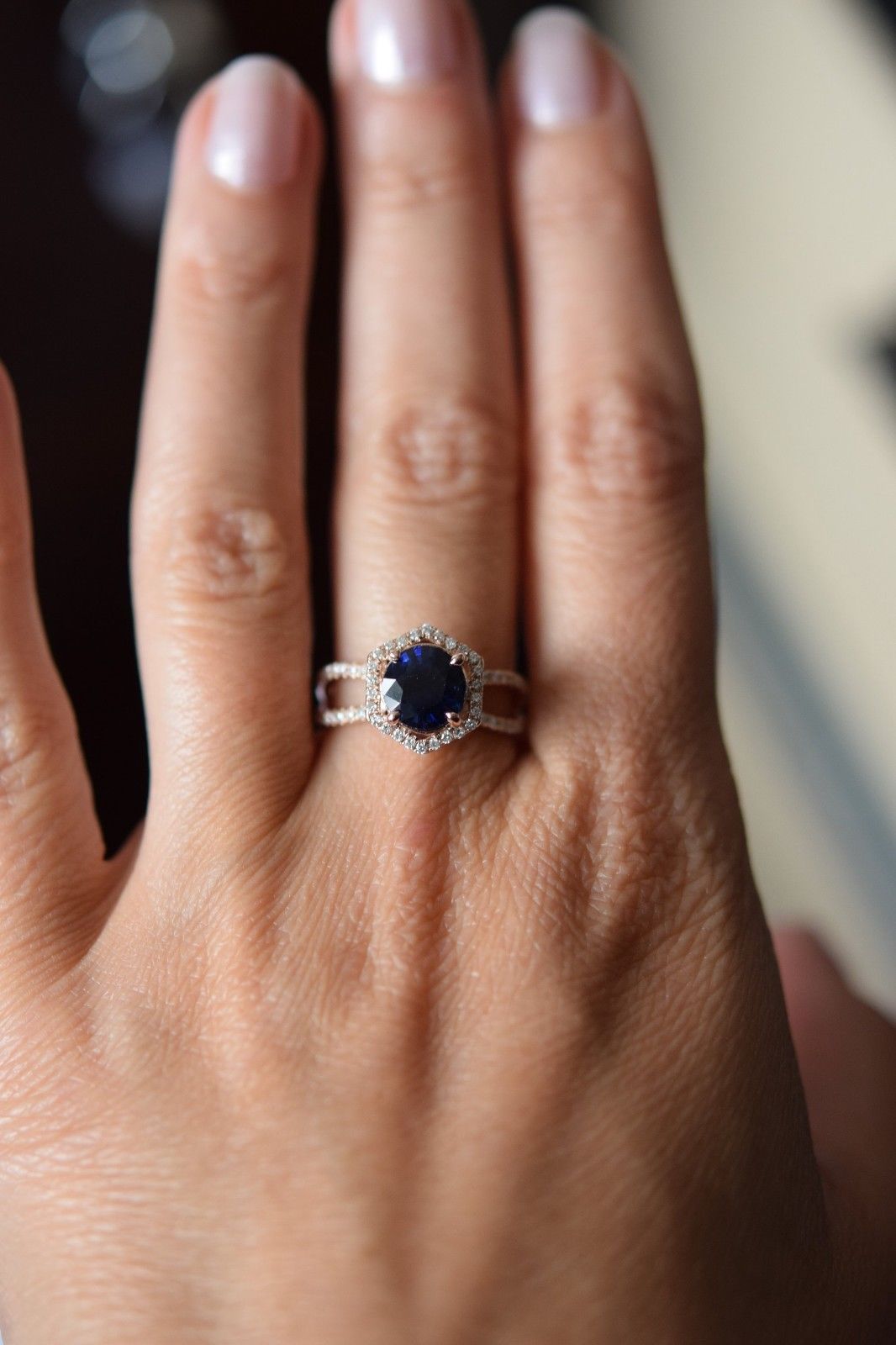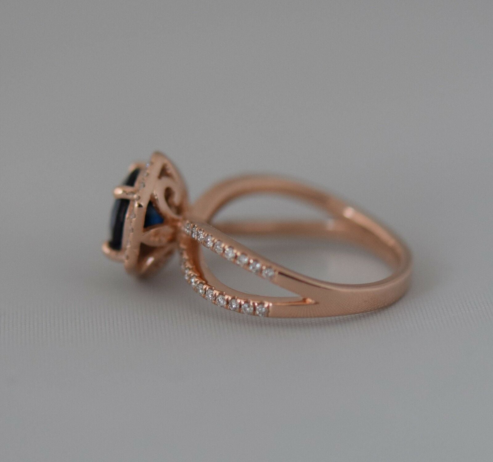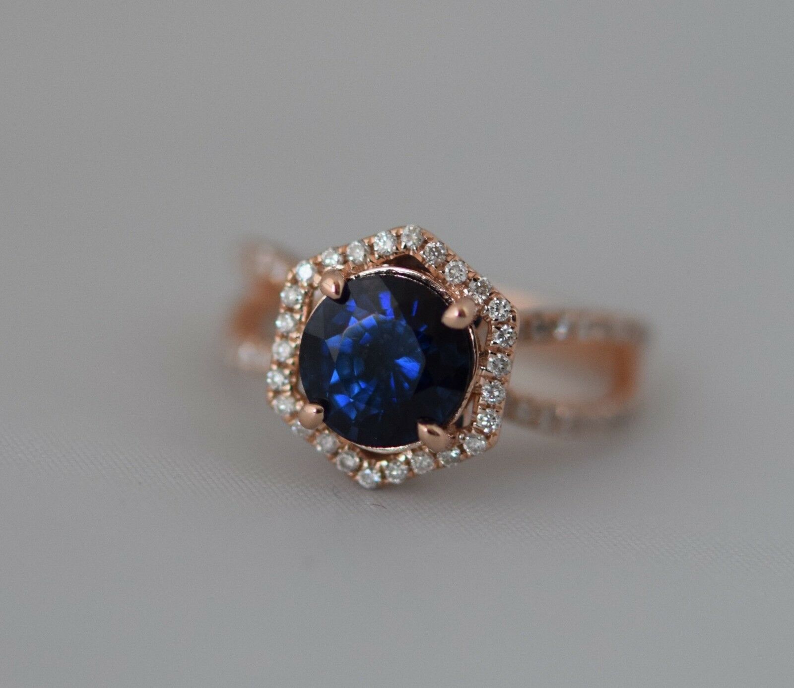 2ct Round Cut Blue Sapphire Split Band Halo Engagement Ring 14k Rose Gold Finish