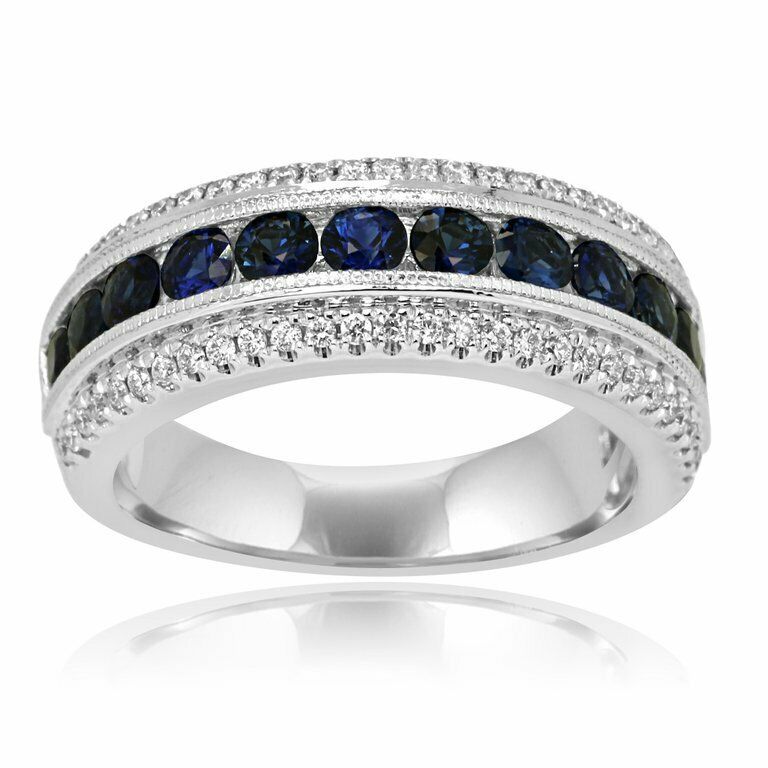 3.6ct Round Cut Blue Sapphire Half Eternity Milgrain Band 14k White Gold Finish