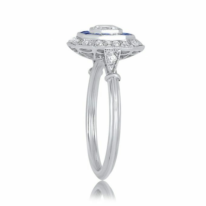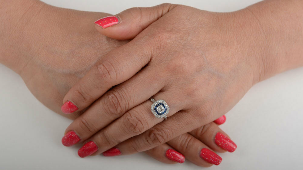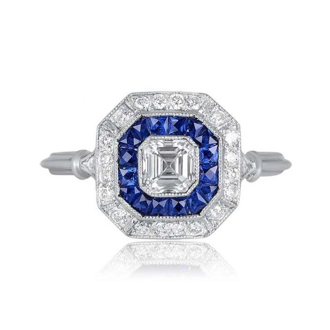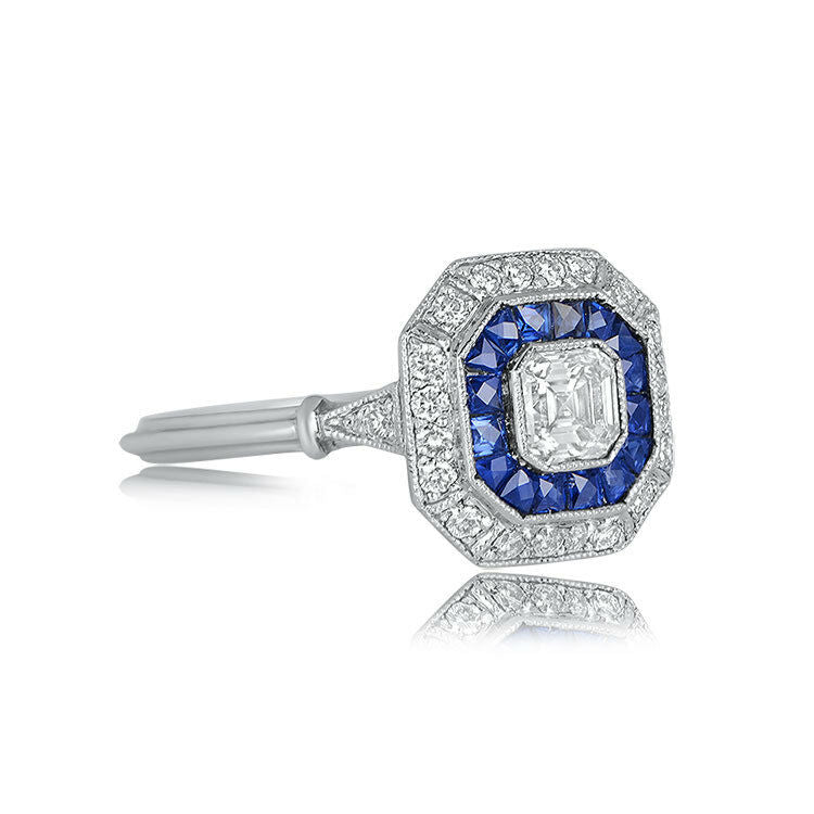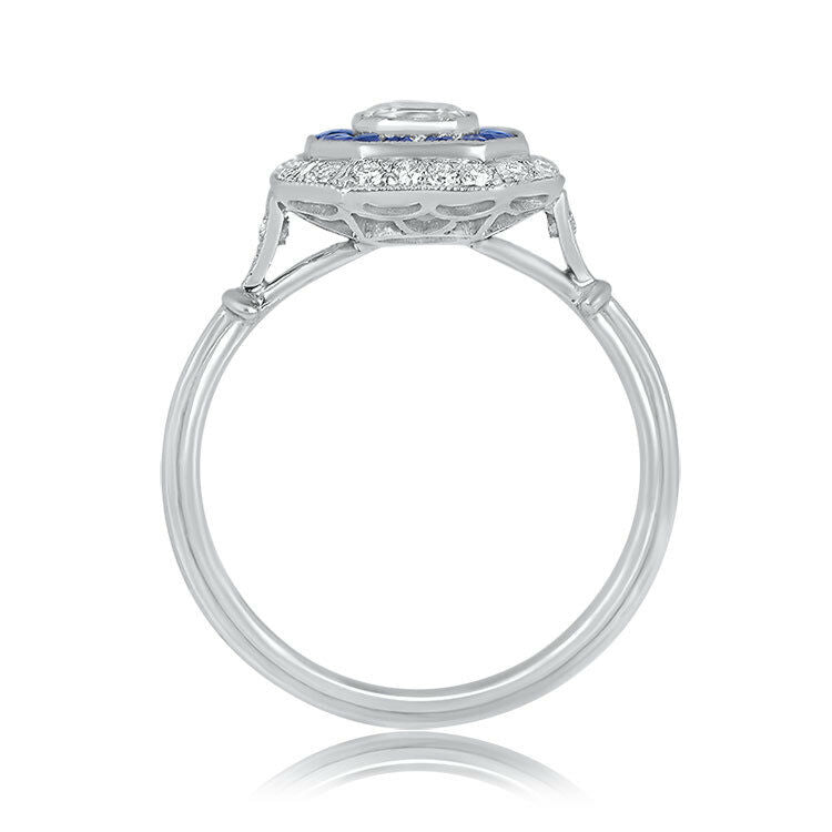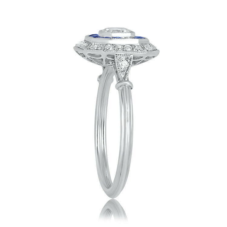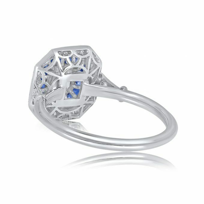 3ct Asscher Cut Diamond Blue Sapphire Halo Art Deco Ring 14k White Gold Finish