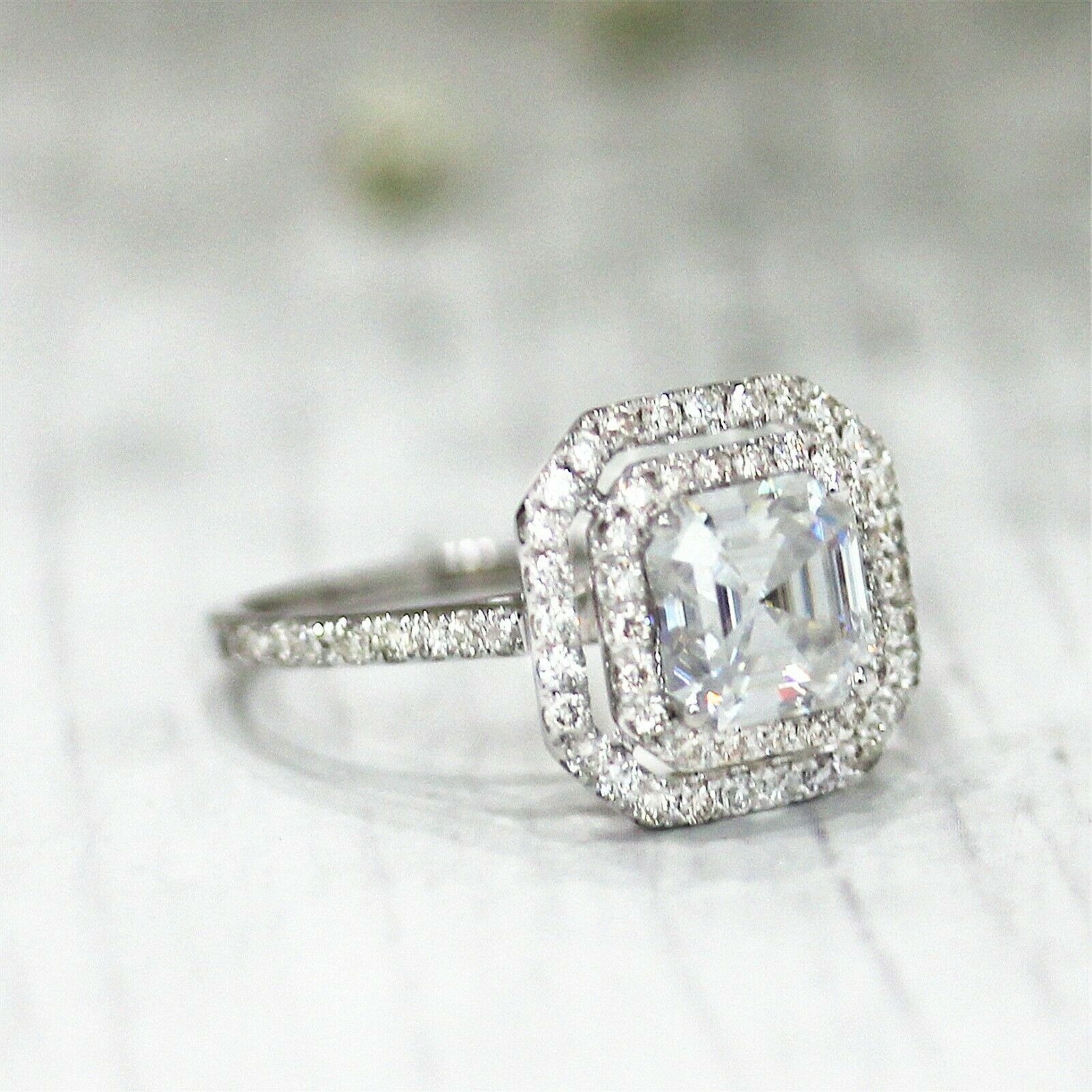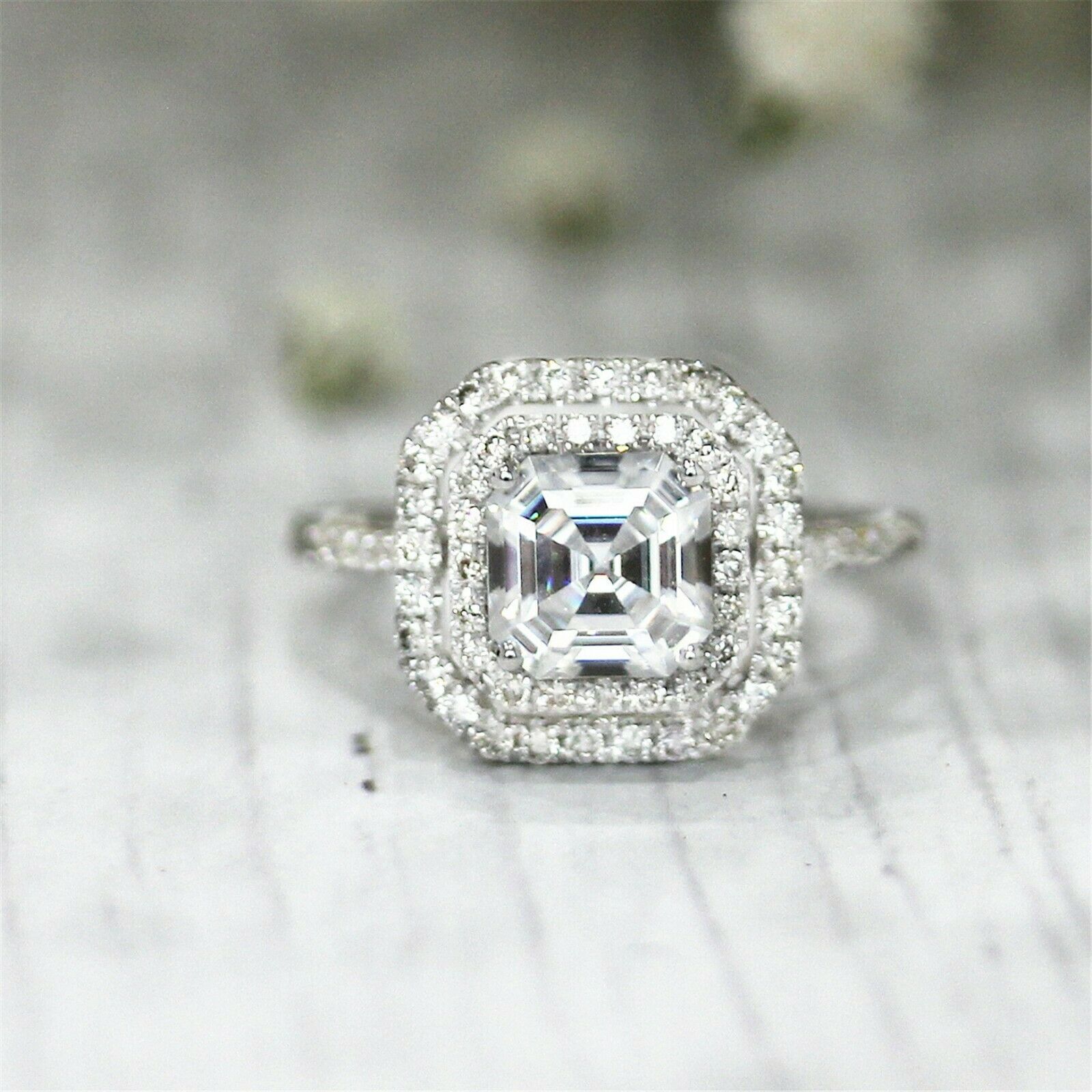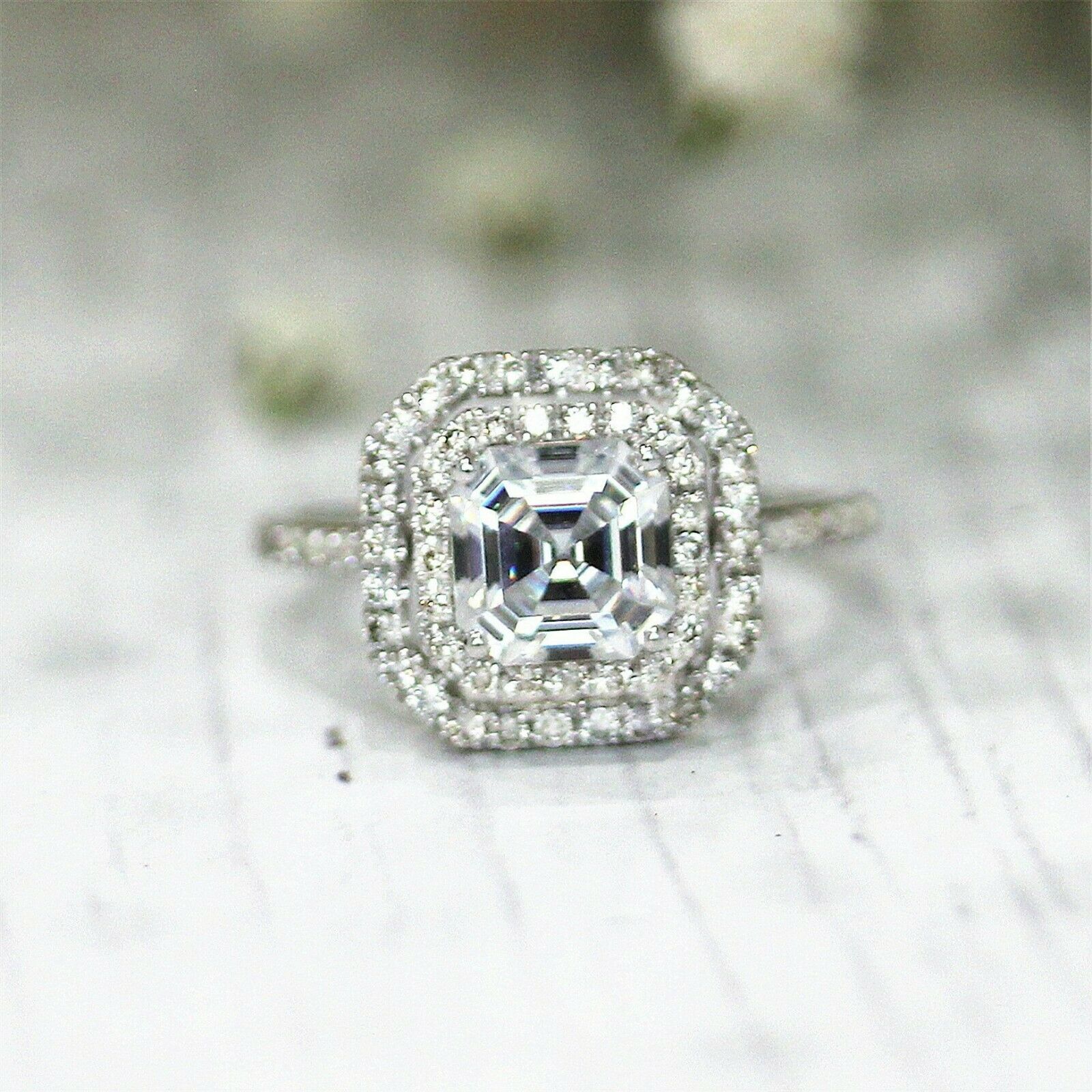 3Ct Asscher Cut DVVS1 Diamond Double Halo Engagement Ring 14K White Gold Finish