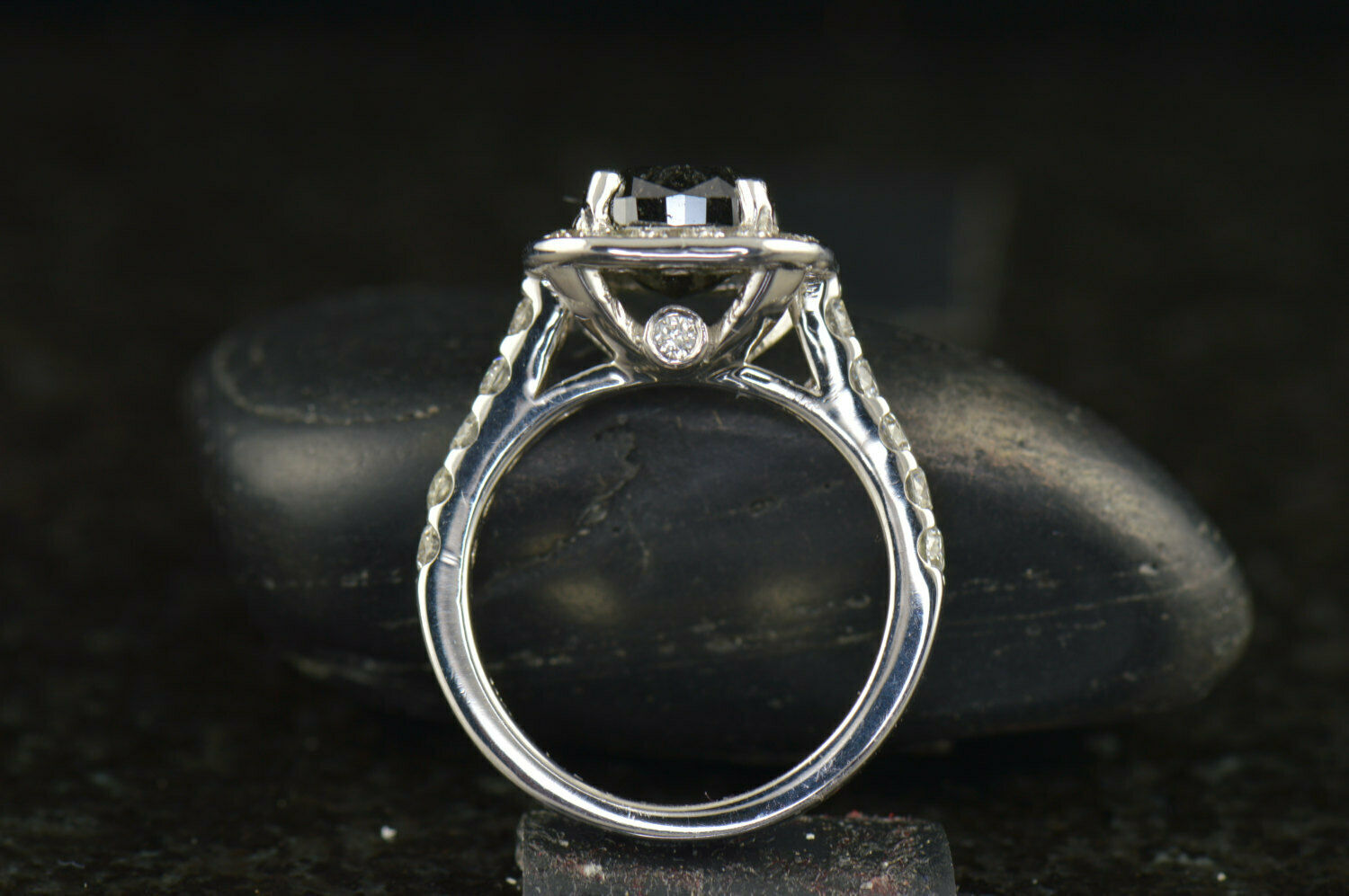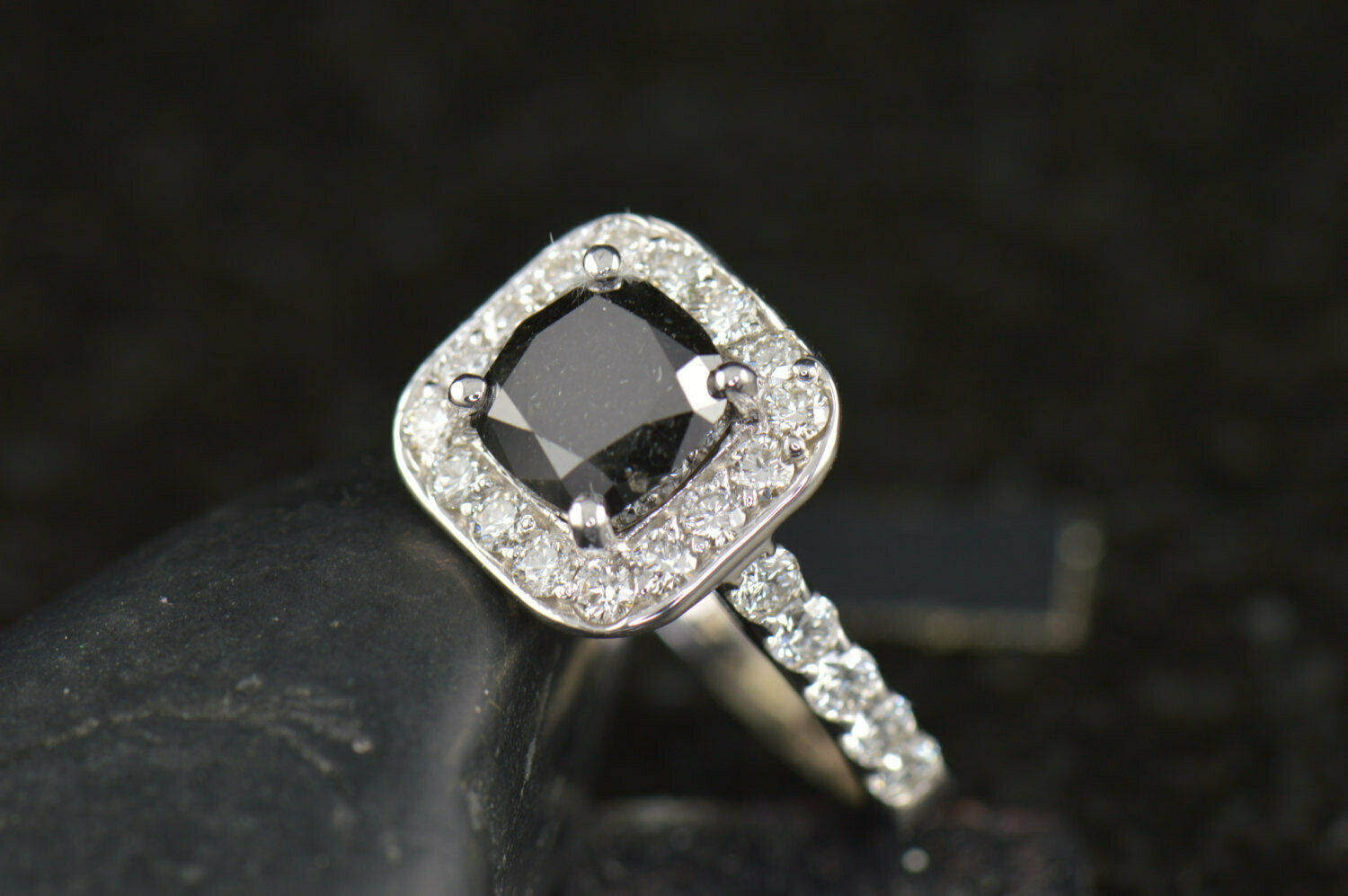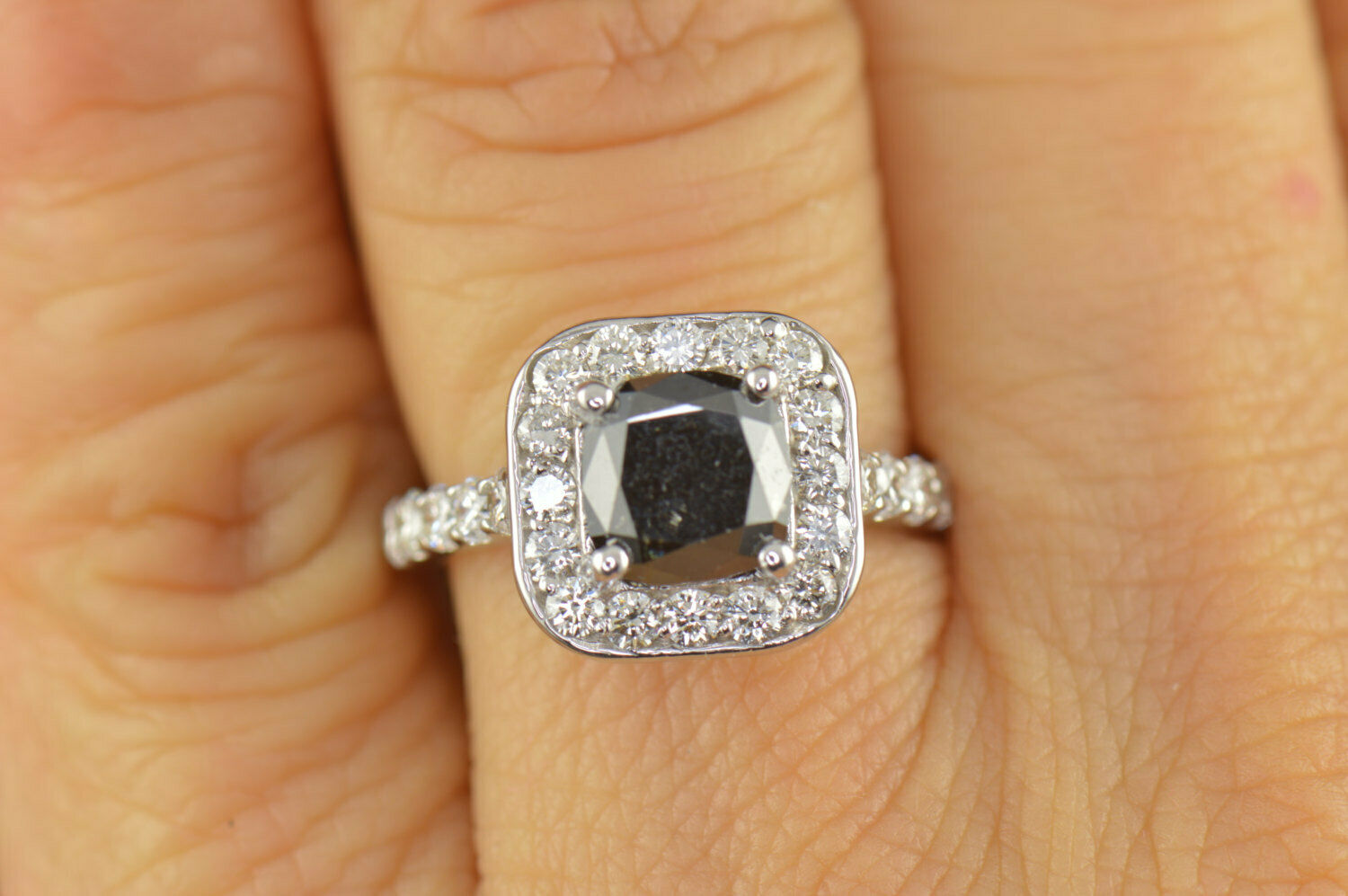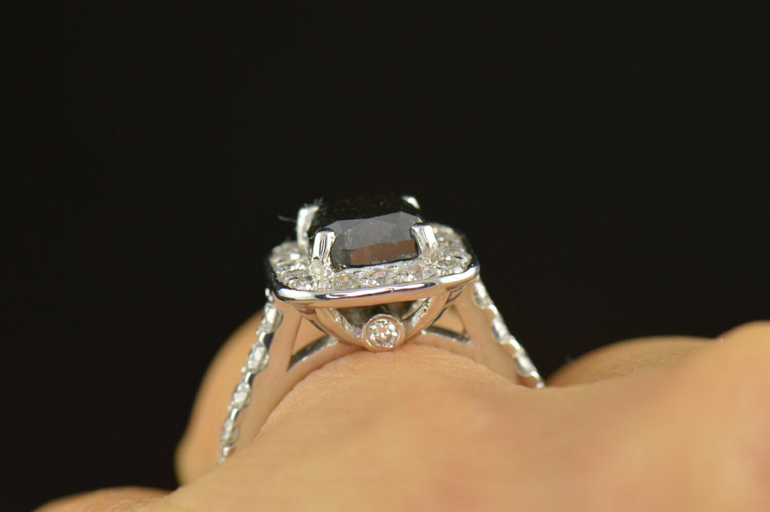 3Ct Cushion Cut Black Diamond Accent Halo Engagement Ring 14K White Gold Finish