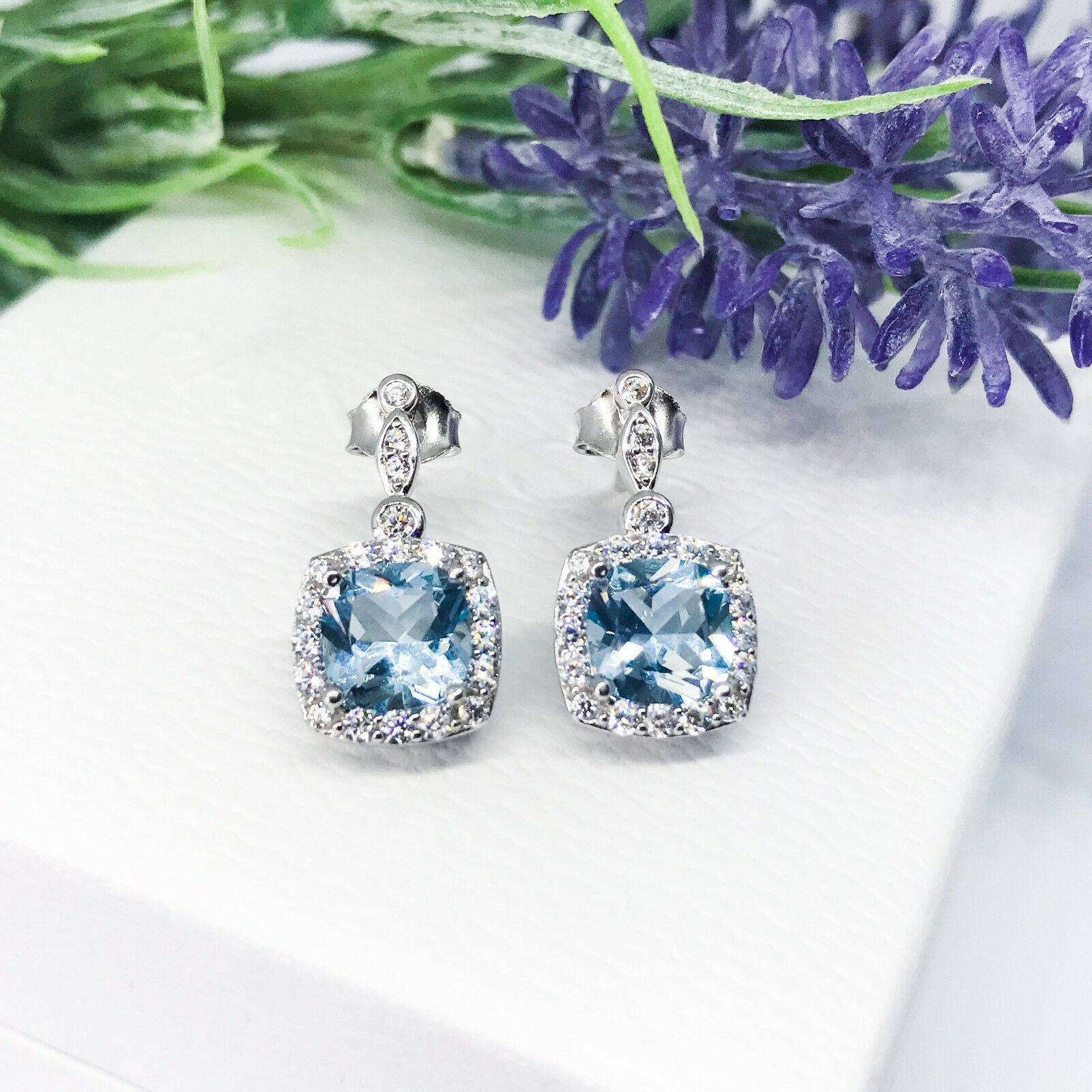 3Ct Cushion Cut Blue Aquamarine Stylish Halo Drop Earrings 14K White Gold Finish