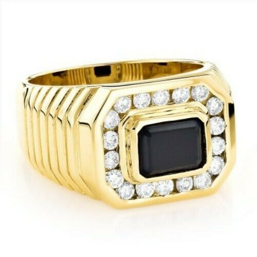 3Ct Emerald Cut Black Diamond Halo Men Engagement Ring 14K Yellow Gold Finish