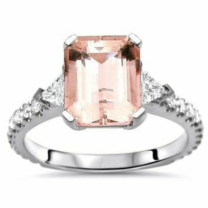 3Ct Emerald Cut Morganite Engagement Ring 14K White Gold Finish Trillion Accents