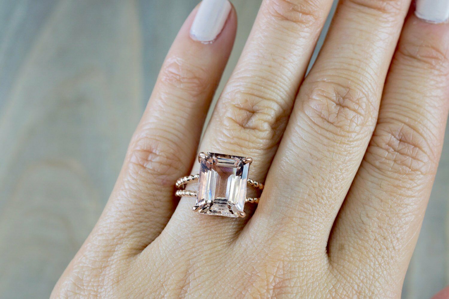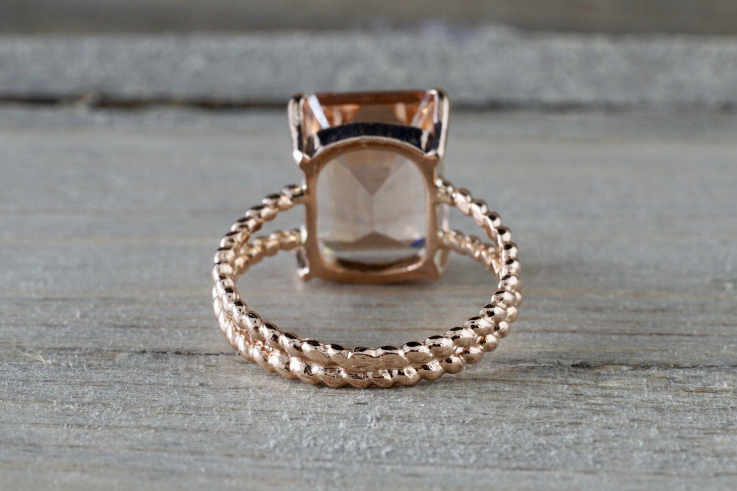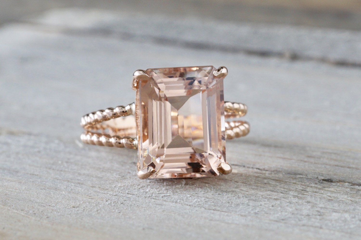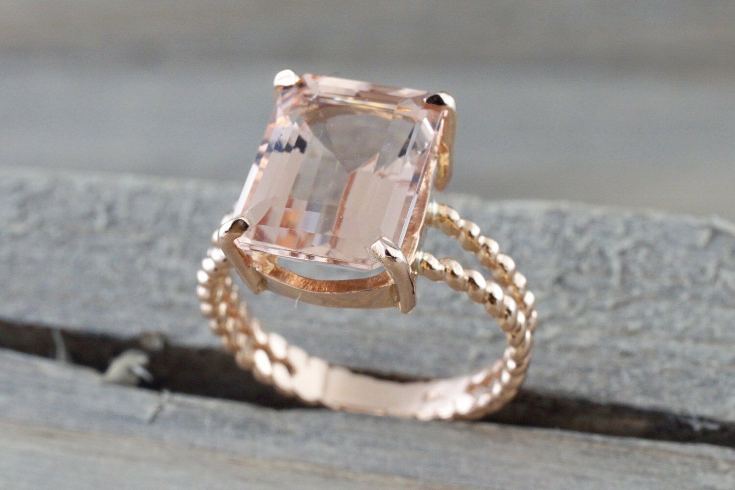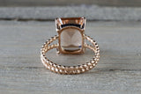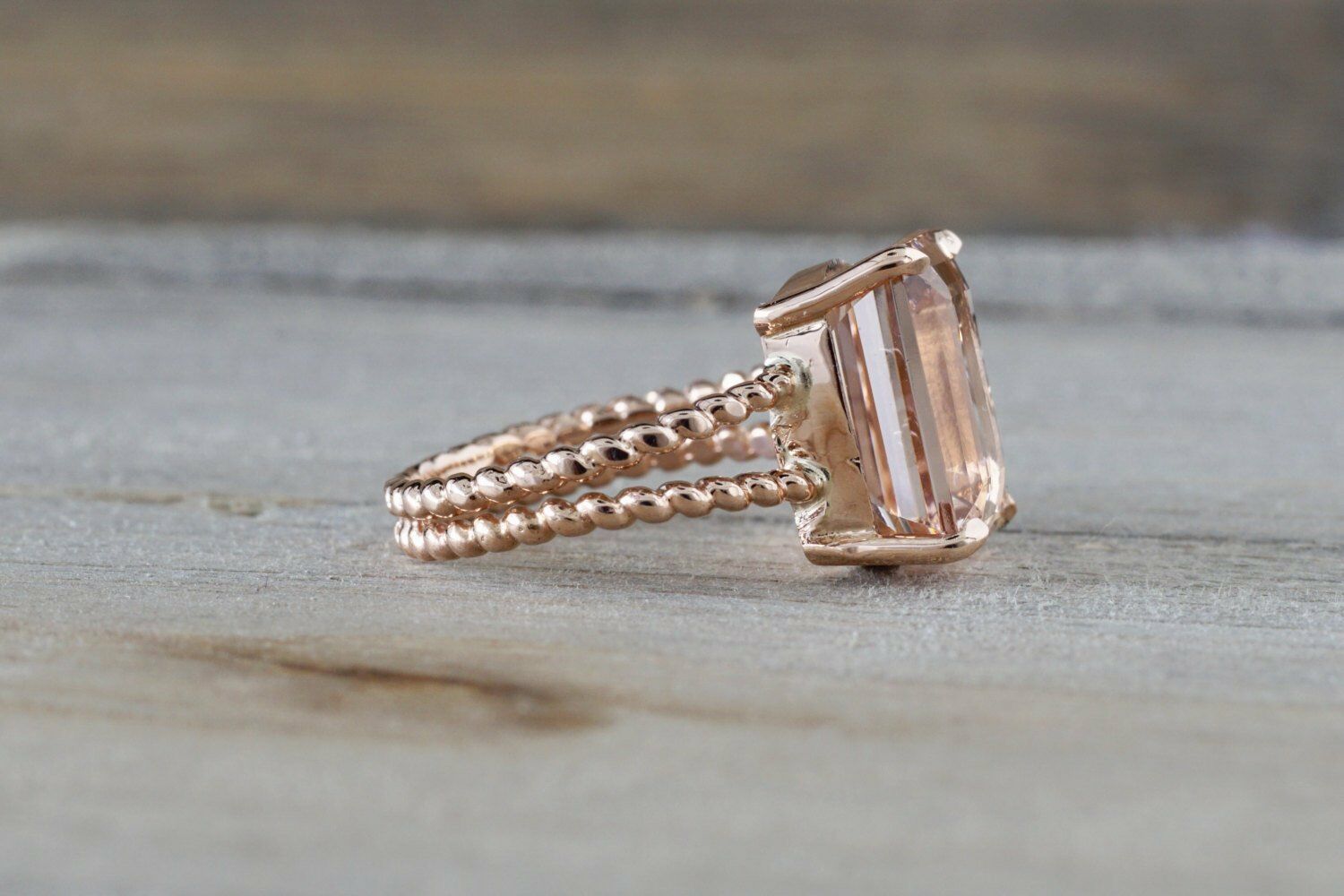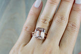 3ct Emerald Cut Peach Morganite Beaded Shank Engagement Ring 14k Rose Gold Over