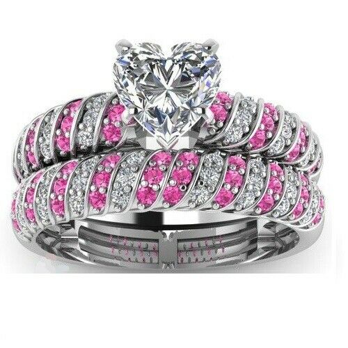 3ct Heart Cut Diamond Pink Stone Bridal Set Engagement Ring 14k White Gold Over