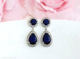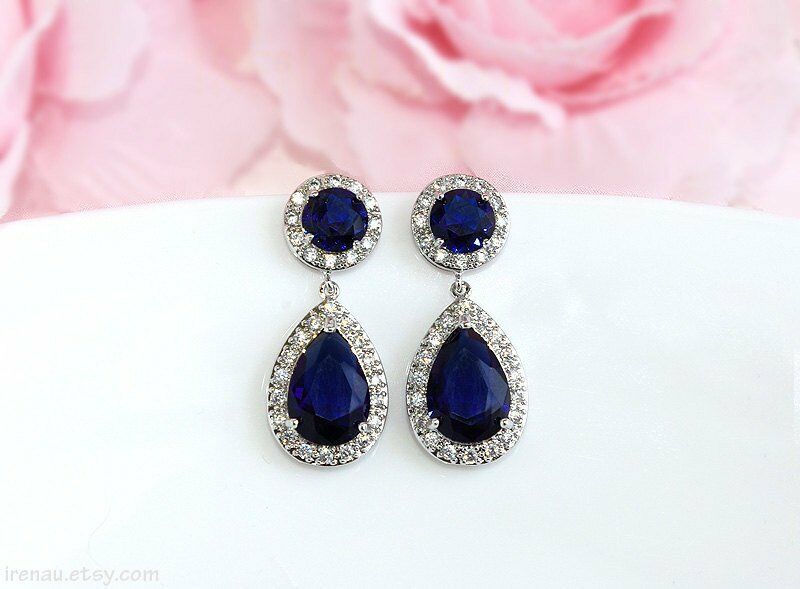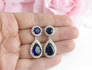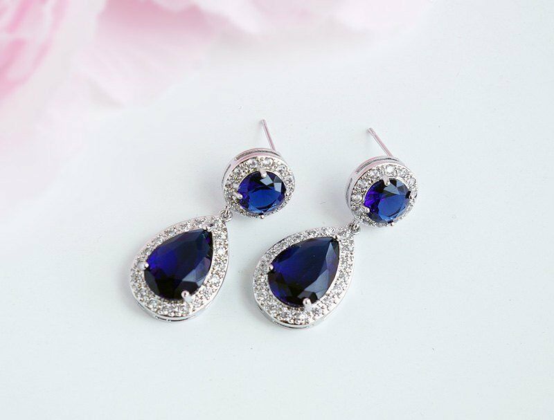 3ct Pear Blue Sapphire Diamond Halo Tear Rain Drop Earring 14k White Gold Finish